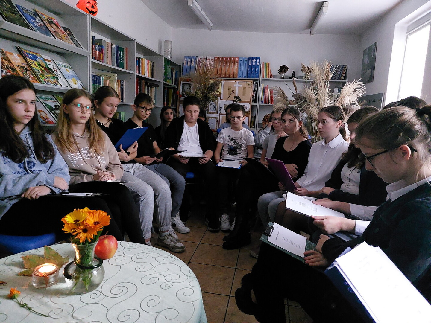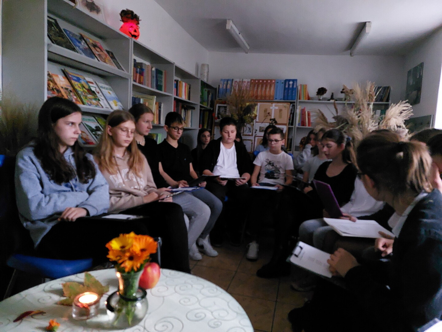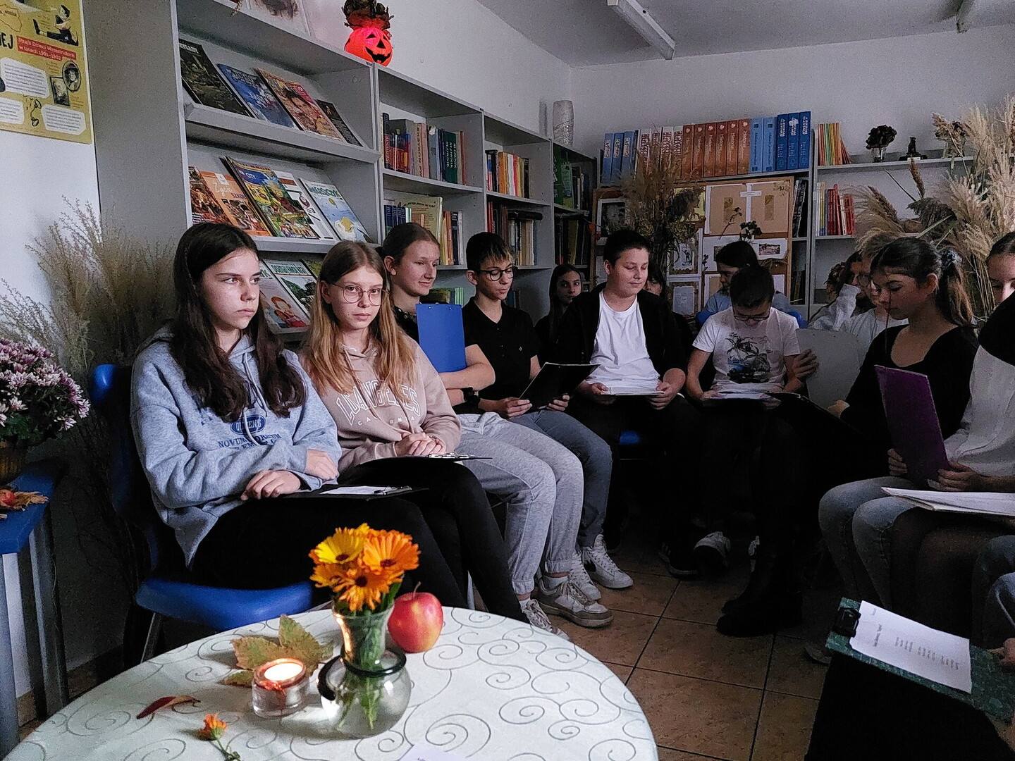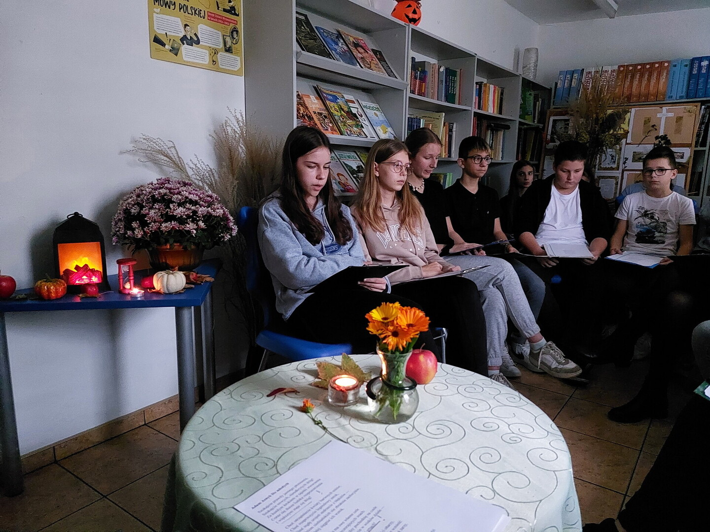 Późnym popołudniem 31 października w czytelni biblioteki szkolnej odbyły się Zaduszki literackie .