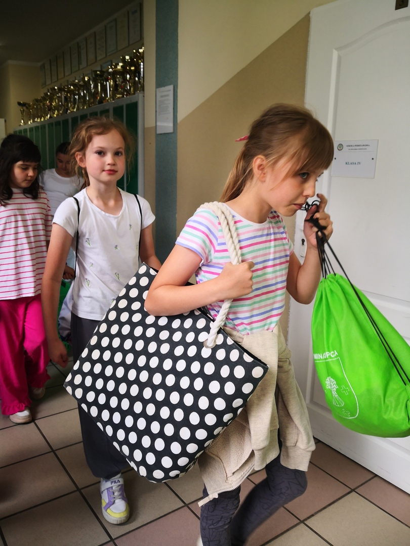Tego dnia uczniowie mieli możliwość przyniesienia do szkoły swoich książek, zeszytów i przyborów szkolnych w inny sposób niż tradycyjny plecak. Pomysłowość uczestników przeszła najśmielsze oczekiwania! Na szkolnych korytarzach można było zobaczyć „zamienniki” plecaków w postaci walizek, koszy na pranie, doniczek, koszyczków, a nawet... w domku dla lalek.