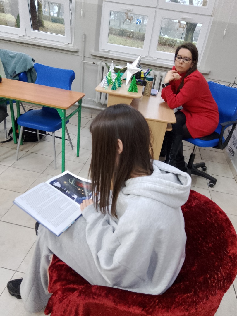 Czytanie przy choince, to coroczna akcja czytelnicza organizowana przez bibliotekę szkolną. Tym razem przy choince zgromadzili się uczniowie klasy 7, którzy wspólnie z nauczycielami przeczytali fragmenty „Opowieści wigilijnej’’ Charlesa Dickensa . Wstępem do lektury były warsztaty twórczości bożonarodzeniowej. Techniką orgiami uczniowie wyczarowali piękne ozdoby choinkowe .Głównym celem spotkania było oddanie się lekturze, która bardzo trafnie wpisuje się w atmosferę zbliżających się świąt Bożego Narodzenia. „Opowieść wigilijna”, to nie tylko historia bożonarodzeniowa, ale także głęboka refleksja nad wartościami ludzkimi. Przez pryzmat przemiany Scroogea Dickens uczy, że prawdziwe szczęście nie polega na bogactwie, lecz na dobroci, empatii i trosce o innych. W życiu należy doceniać to co mamy i cieszyć się z małych rzeczy, albowiem to one nadają sens naszej doczesnej egzystencji, a szczęście jest prawdziwe tylko wtedy, kiedy się nim dzielimy – to najważniejszy wniosek, jaki uczniowie wyciągnęli z lektury. Historia Scroogea to lekcja pokazująca, że kluczem do udanego życia są relacje międzyludzkie. Ten przedświąteczny okres, to czas na głębokie refleksje i przemyślenia. Pamiętajmy ,że nigdy nie jest za późno na zmianę na lepsze.