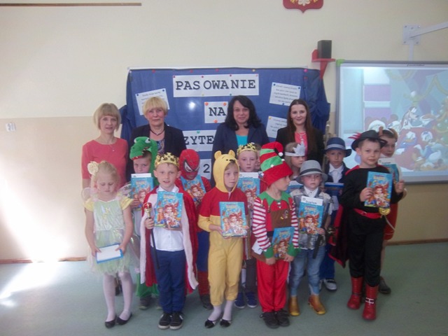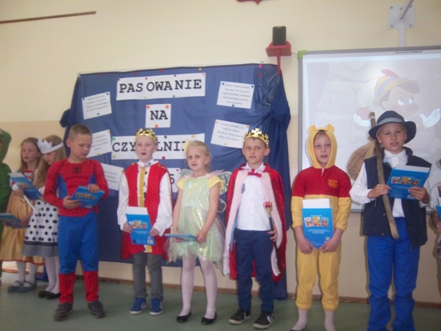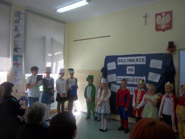 Dnia 29.05.2015r. uczniowie klasy I Szkoły Podstawowej w Koszutach zostali pasowani na czytelników biblioteki szkolnej. W inscenizacji pt. "Bajkowy świat" przygotowanej pod kierunkiem Urszuli Jantosz oraz Anny wzięli udział zaproszeni goście tj. Pani Seweryna Lewandowska Dyrektor Miejskiej i Powiatowej Biblioteki w Słupcy , Pani Aldona Dranikowska Dyrektor Szkoły Podstawowej w Koszutach oraz rodzice pierwszaków. Dzieci uraczyły wszystkich bajkowymi strojami. Każdy otrzymał pamiątkę pasowania oraz dyplom czytelnika, który uprawnia ich do samodzielnego korzystania z zasobów biblioteki szkolnej. Rodzice przekazali podarunek w postaci książek oraz przygotowali pyszny poczęstunek. Pierwszakom życzymy pięknej przygody z książką.
