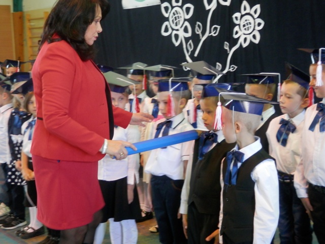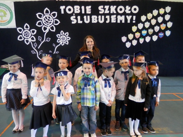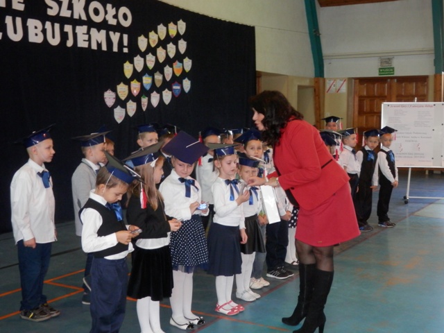 Z przejęciem przyrzekali, że będą dbać o honor szkoły, szanować rodziców, nauczycieli, koleżanki i kolegów. Po złożeniu przysięgi Pani Dyrektor pasowała każdego pierwszoklasistę na pełnoprawnego ucznia. Następnie każdy pierwszak złożył podpis pod aktem ślubowania i otrzymał pamiątkowy akt mianowania. Ksiądz Ksawery Wilczyński pobłogosławił dzieci i ich plecaki z całą zawartością.