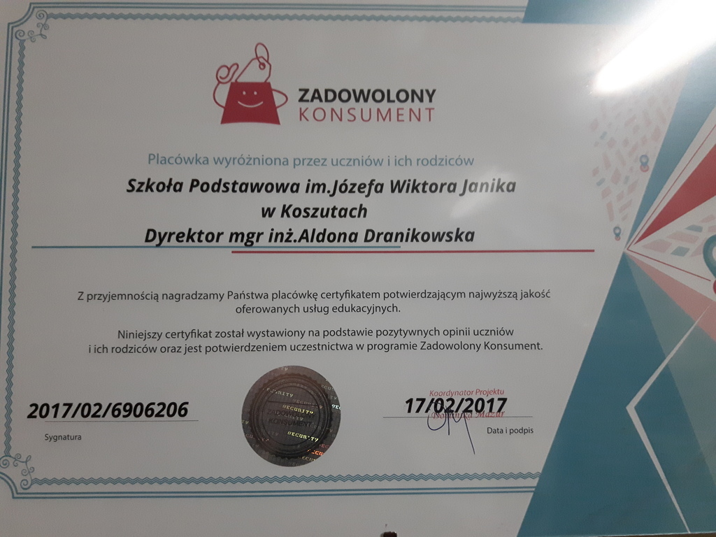 17.02.2017r. Szkoła Podstawowa w Koszutach została nagrodzona certyfikatem Zadowolony Konsument, potwierdzającym najwyższą jakość oferowanych usług edukacyjnych.