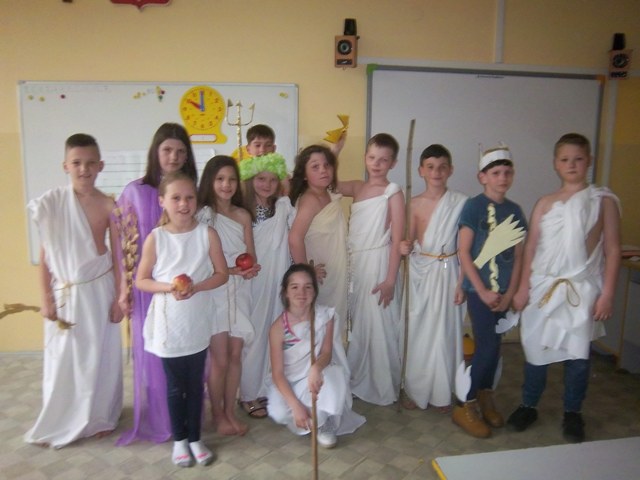W ciekawy sposób zaprezentowali swych ulubionych Bogów. Pięknie przygotowane stroje i atrybuty władców wymagały dużego zaangażowania. Było warto! Bogowie wyglądali imponująco i bardzo podobali się uczniom klas młodszych.