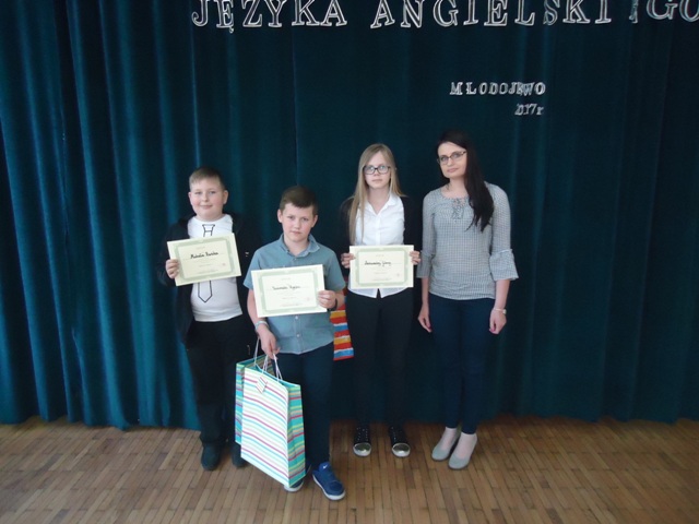 W tym roku reprezentanci naszej szkoły wywalczyli aż dwa zaszczytne tytuły Gminnego Mistrza Języka Angielskiego w kat. klas IV-Michał Rusik oraz kat. klas V-Konrad Pająk. Co więcej, Aleksandra Górna, która reprezentowała klasę V również poradziła sobie bardzo dobrze uzyskując II miejsce.