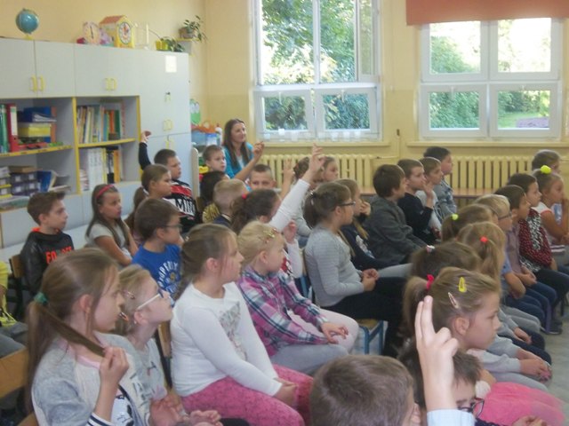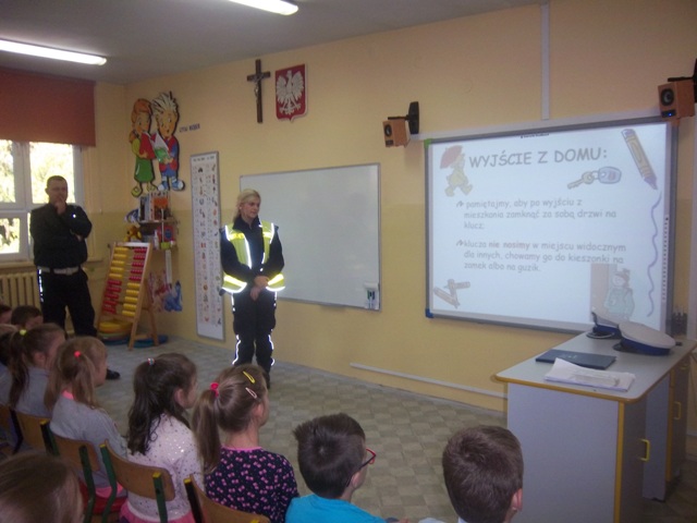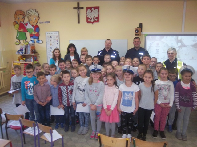 29 września 2017 roku w naszej szkole w ramach cyklu spotkań „Poznajemy zawody” uczniów klas młodszych odwiedzili przedstawiciele Komendy Powiatowej Policji w Słupcy. Dzieci miały okazję porozmawiać z policjantami o zachowaniu bezpieczeństwa w drodze do i ze szkoły, o bezpiecznym przechodzeniu przez ulicę, prawidłowym zachowaniu się podczas jazdy rowerem, bezpiecznym zachowaniu w czasie oczekiwania na autobus szkolny, jak również o ostrożności podczas wsiadania i wysiadania z autobusu.