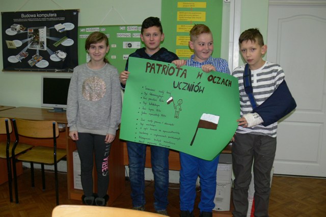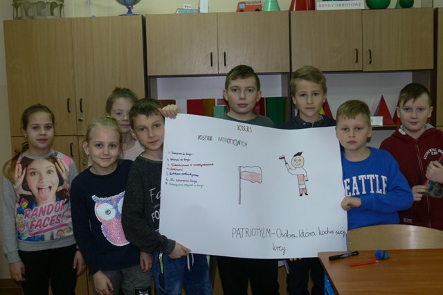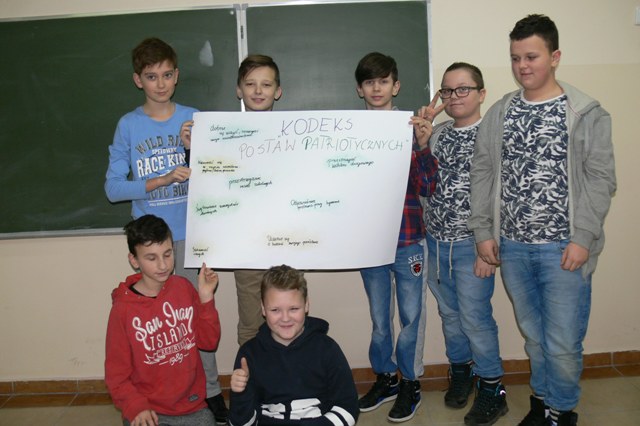 Nasza szkoła bierze udział w konkursie ,,Szkoła młodych patriotów”, który polega na wykonaniu kilku zadań. Jednym z nich jest przygotowanie Kodeksu Postaw Patriotycznych. W jego tworzenie włączyli się uczniowie klas IV-VII, rodzice i nauczyciele. W styczniu uczniowie każdej klasy przygotowali swoje propozycje, a następnie Samorząd Uczniowski nadał dokumentowi ostateczny, końcowy wygląd – wybrał powtarzające się najczęściej wypowiedzi, układając je w formie kodeksu. Natomiast w lutym podczas wywiadówek z wychowawcami klas, na których odbyło się podsumowanie pracy w I semestrze roku szkolnego 2017/2018, rodzice opracowali własny kodeks. Opinie dorosłych w większości pokrywały się ze zdaniem dzieci. Zarówno dla jednych jak i drugich ważna była znajomość historii własnego kraju, pielęgnowanie tradycji narodowej, czynny udział w uroczystościach państwowych, a także bycie dumnym z przynależności narodowej.