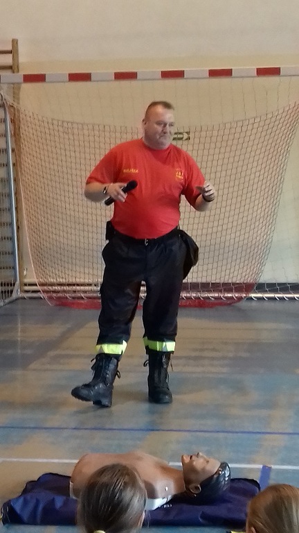 Pan Wojciech Młodożeniec – prezes jednostki niezwykle ciekawie opowiadał o wyjątkowo trudnej i odpowiedzialnej pracy strażaków. Najważniejszym jednak elementem spotkania był pokaz udzielania pierwszej pomocy przedmedycznej. Uczniowie mieli sposobność przećwiczenia tych umiejętności na fantomach po to, by w sytuacji zagrożenia umieć poradzić sobie i uratować, być może, życie poszkodowanego człowieka. Dzieciaki ćwiczyły z dużym zaangażowaniem i przekonały się, iż to wymagające zadanie.