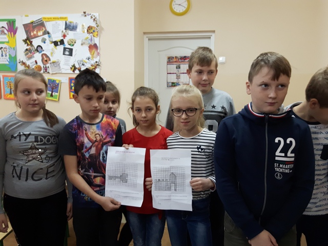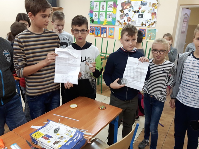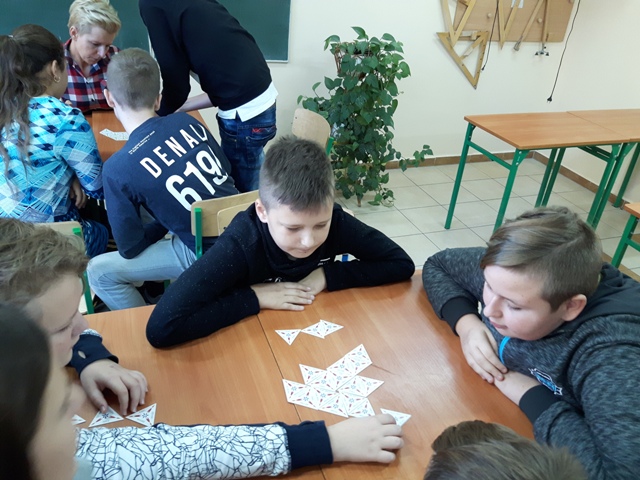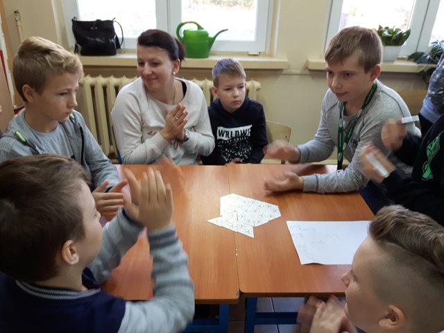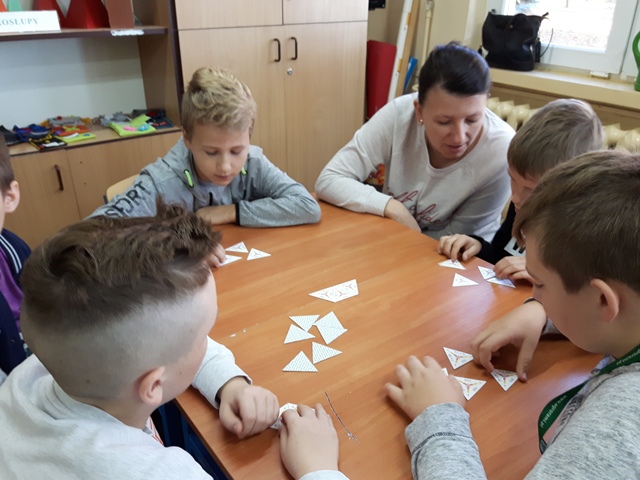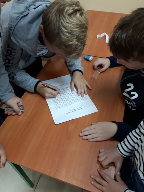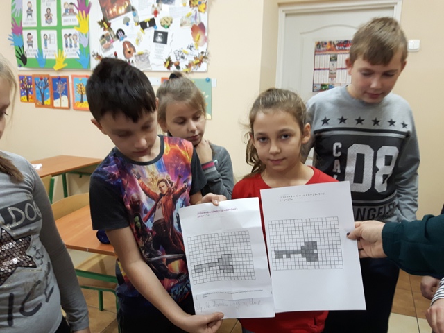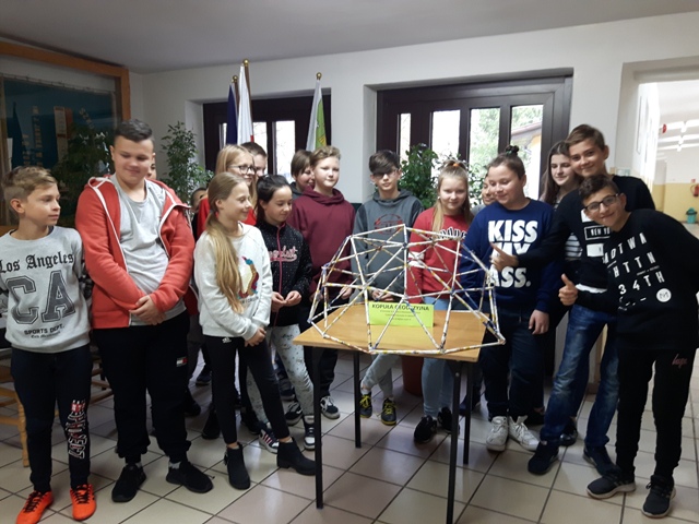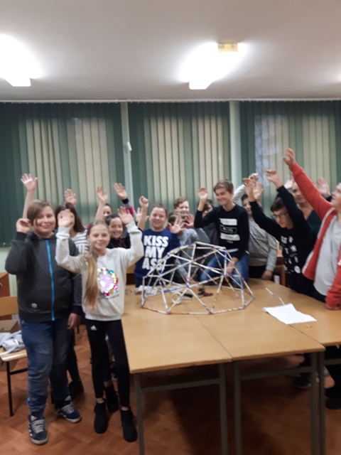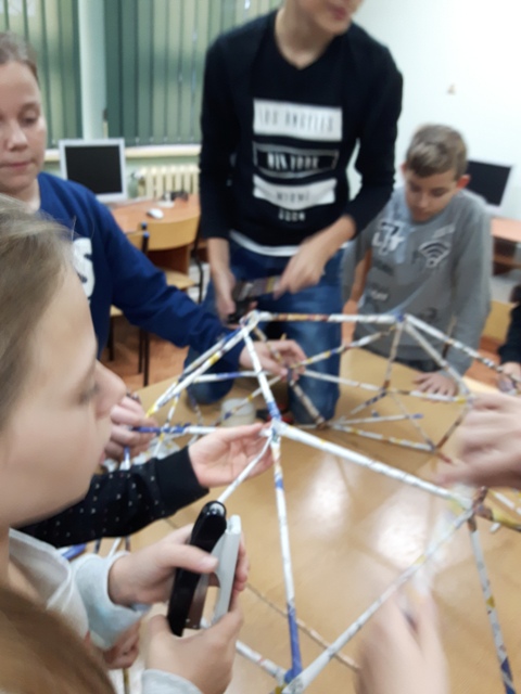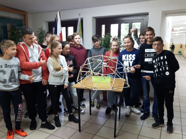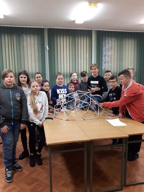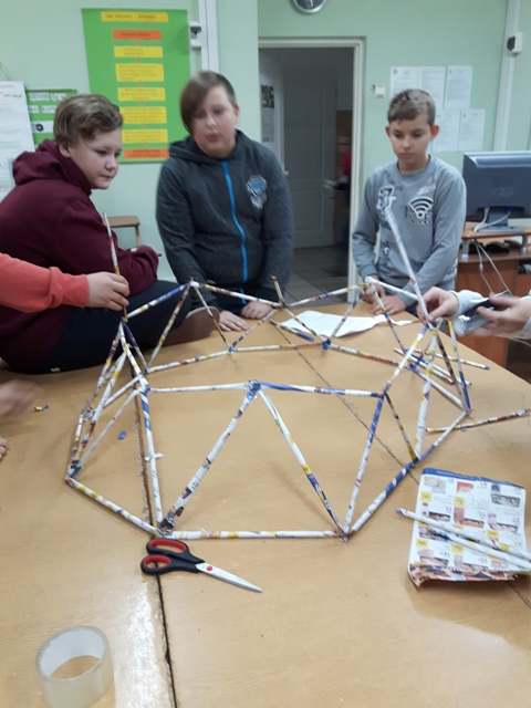 W październiku zrealizowano kolejny etap projektu. „Na tropie brył”- to podchody matematyczne, które zorganizowaliśmy jako kolejne działanie naszego projektu „Z matematyką nam po drodze” w ramach programu mPotęga dofinansowanego przez Fundację mBanku. Uczniowie klas 4-6, zostali podzieleni na trzy grupy. Zadaniem ich było odszukać ukryte w słoikach zadania, jak najszybciej rozwiązać je prawidłowo i dotrzeć do wyznaczonego celu, gdzie czekała na zwycięzców słodka niespodzianka. Wśród poleceń były łamigłówki oraz zadania związane z programowaniem. Uczniowie klasy 6 wykonali kopułę geodezyjną, składającą się z trójkątów.