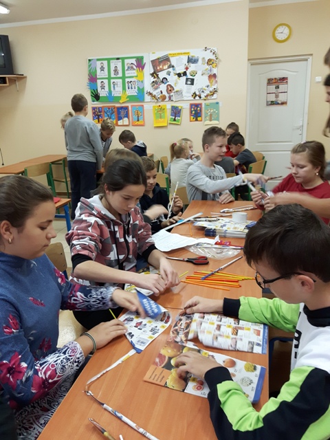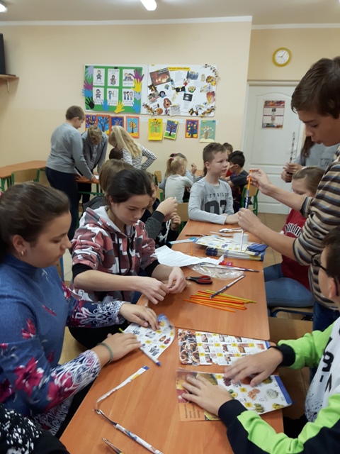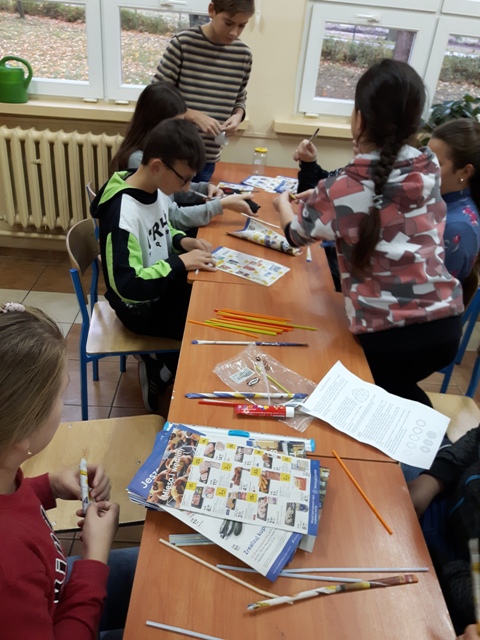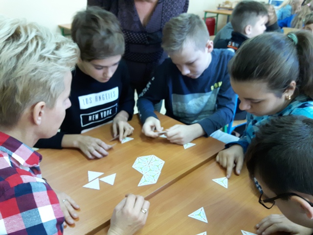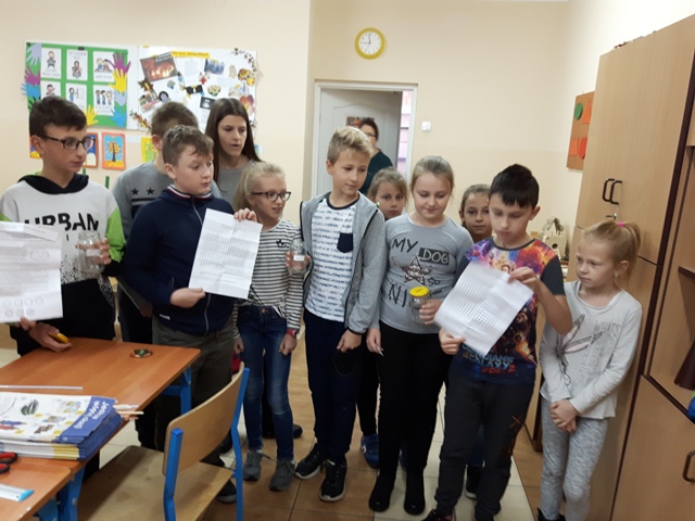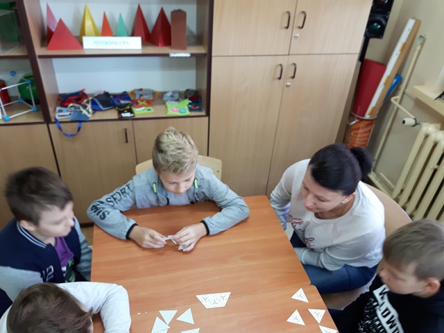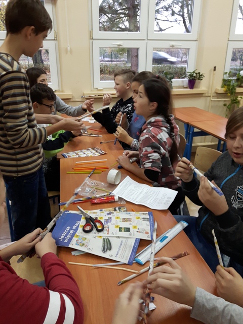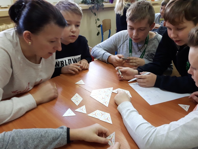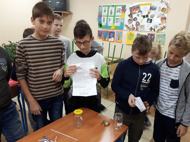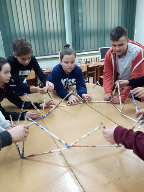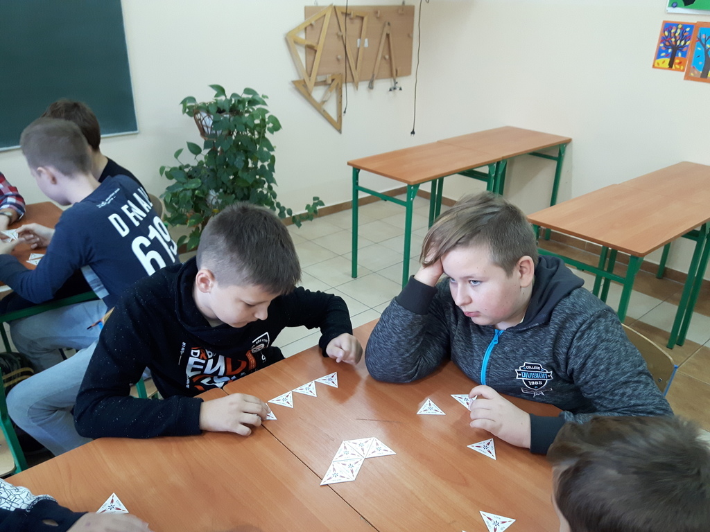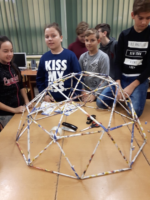 W październiku zrealizowano kolejny etap projektu. „Na tropie brył”- to podchody matematyczne, które zorganizowaliśmy jako kolejne działanie naszego projektu „Z matematyką nam po drodze” w ramach programu mPotęga dofinansowanego przez Fundację mBanku. Uczniowie klas 4-6, zostali podzieleni na trzy grupy. Zadaniem ich było odszukać ukryte w słoikach zadania, jak najszybciej rozwiązać je prawidłowo i dotrzeć do wyznaczonego celu, gdzie czekała na zwycięzców słodka niespodzianka. Wśród poleceń były łamigłówki oraz zadania związane z programowaniem. Uczniowie klasy 6 wykonali kopułę geodezyjną, składającą się z trójkątów.