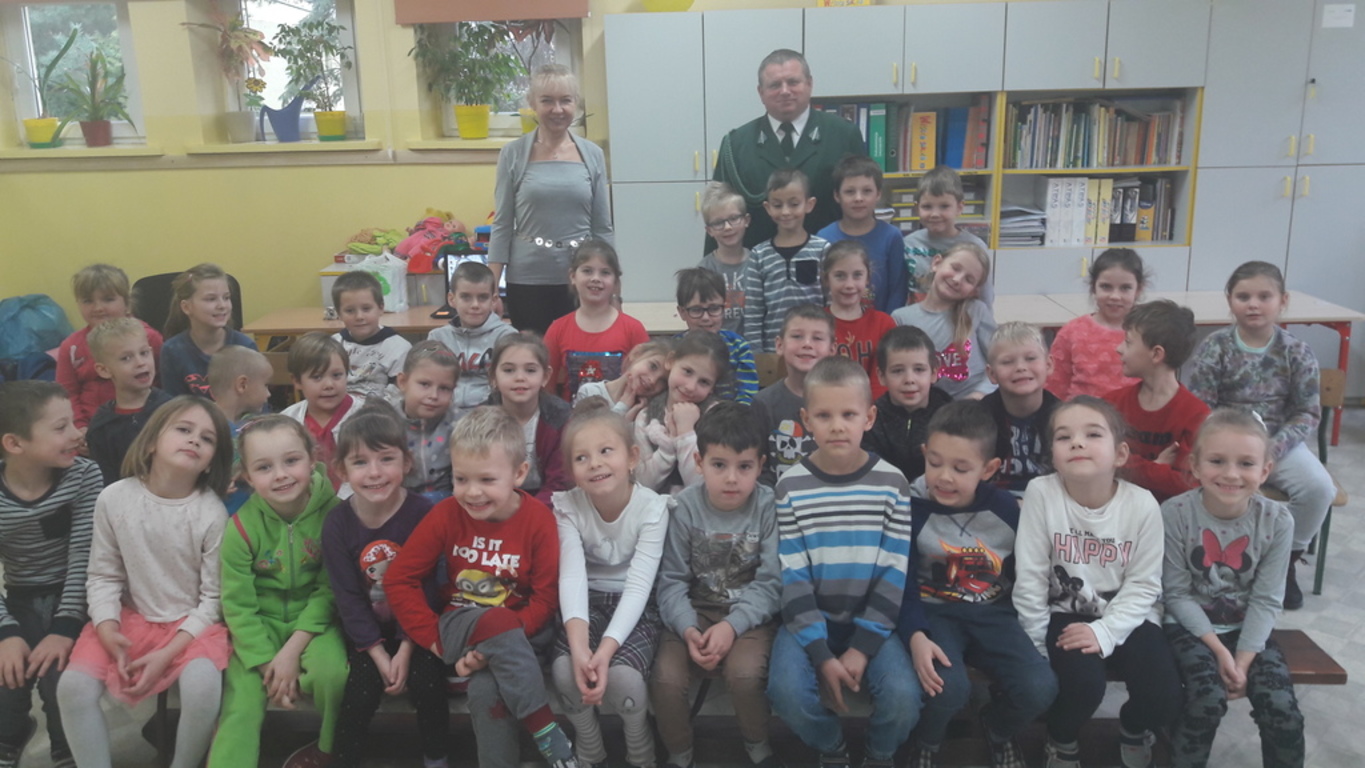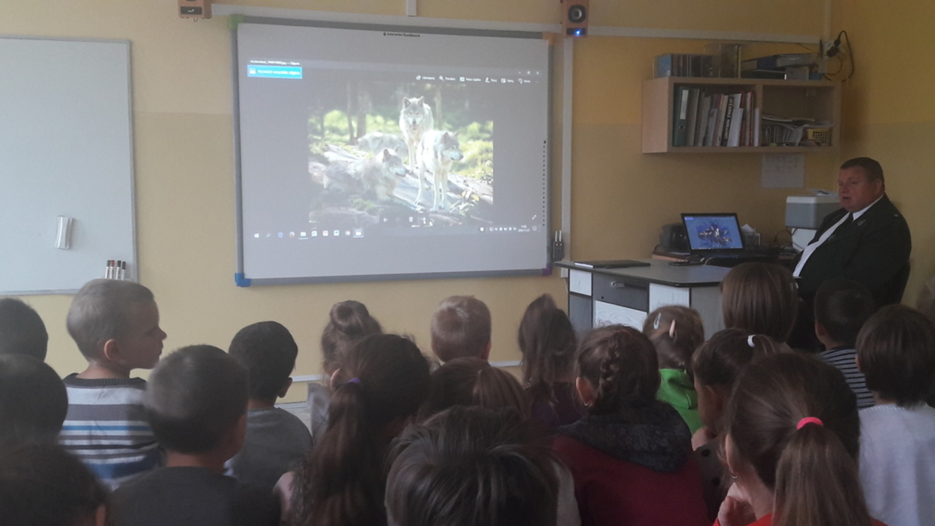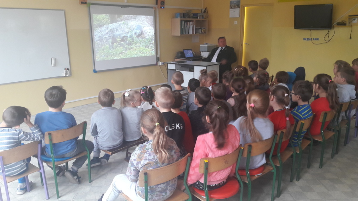 W dniu 21.11. 18 r. przybył do naszej szkoły myśliwy. W spotkaniu brali udział uczniowie klas ,,0 – III”. W przedstawionej prezentacji myśliwy pokazał życie zwierząt w ich naturalnym środowisku. Pogłębił wiedze uczniów na ten temat. Uczniowie słuchali z zainteresowaniem i zadawali pytania. Myśliwy obdarował każde dziecko, wręczając książkę – kolorowankę edukacyjną o zwierzętach. Dzieci podziękowały za przybycie wręczając kwiatek.