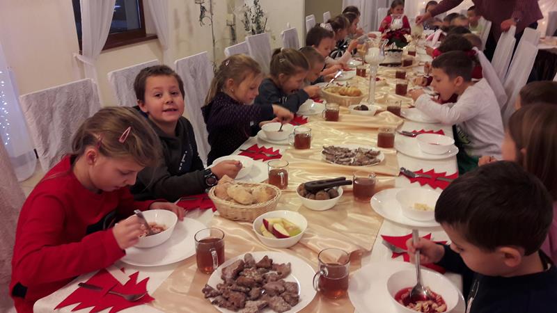 14 grudnia uczniowie klas: 0, I i III wraz z wychowawczyniami wybrali się na wycieczkę do Biskupina, gdzie uczestniczyli w warsztatach wigilijnych. Dzieci wysłuchały przy rozpalonym kominku prelekcji na temat staropolskich zwyczajów i obrzędów wigilijnych. Po tej części zostały podzielone na dwie grupy. W pierwszej grupie po złożeniu przysięgi kucharzy, dzieci przystąpiły do wyrabiania ciasta, z którego samodzielnie wykonały smaczne pierniczki. Następnie wyrabiały bułeczki. Pierniki po upieczeniu zostały polukrowane. W drugiej grupie dzieci wykonywały aniołki i stroiki, które zabrały do domu. Później nastąpiła zamiana. Na zakończenie przystąpiliśmy do wspólnej wigilii i łamania się opłatkiem. Na stole nie zabrakło tradycyjnych dań tj. ryby, barszczu czy kapusty z grzybami, ale oprócz tego znalazły się także wcześniej upieczone bułeczki i pierniki. Wyjazd do Biskupina okazał się fantastycznym pomysł, gdyż przygotowane atrakcje wprawiły nas w absolutnie świąteczny nastrój.