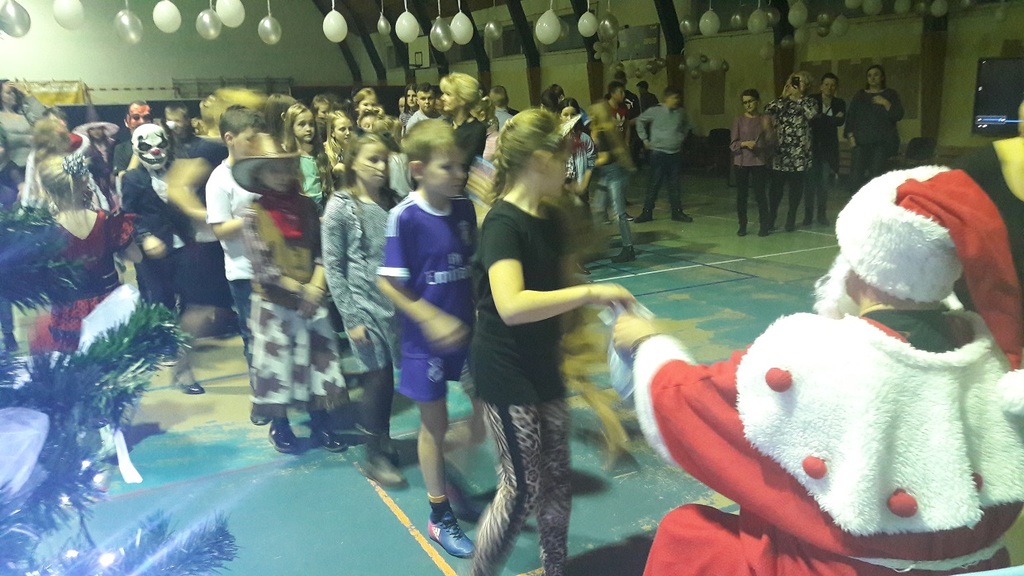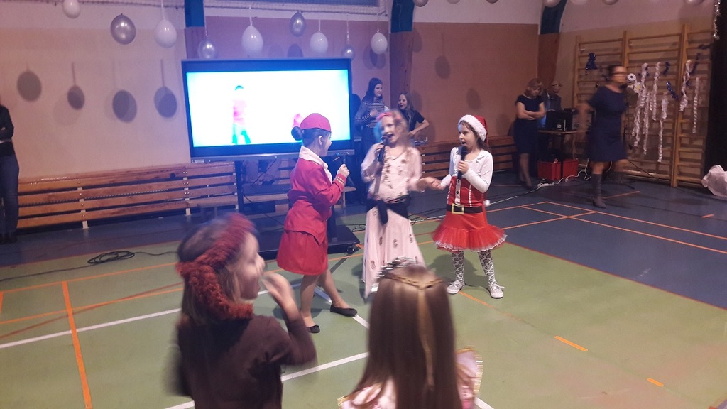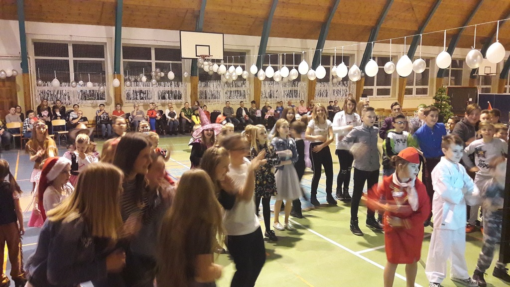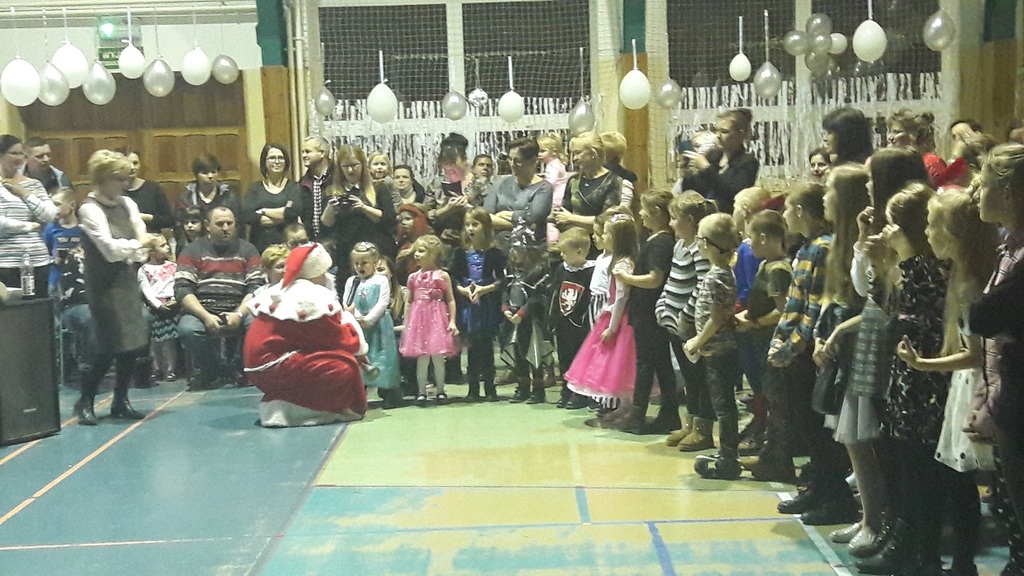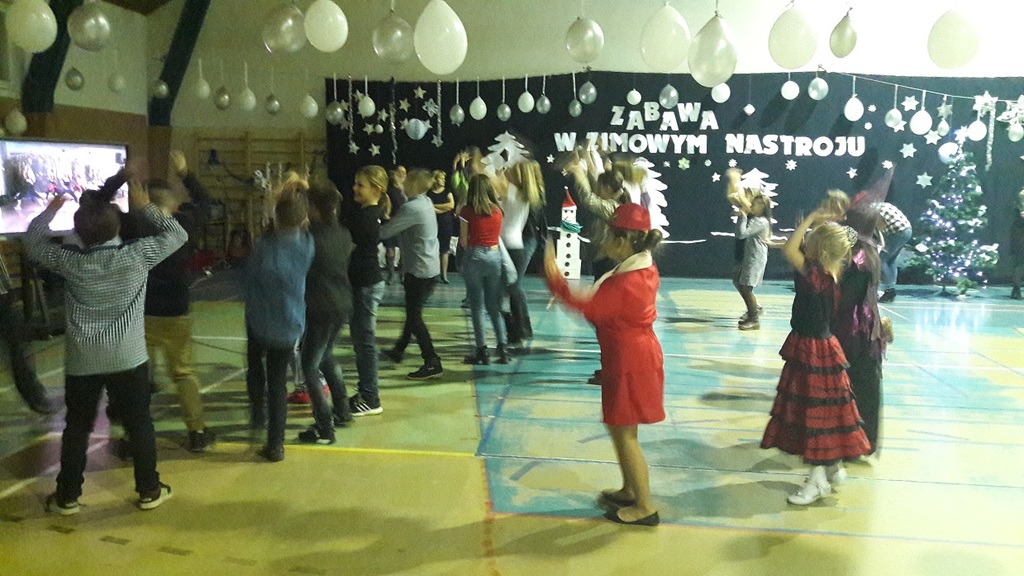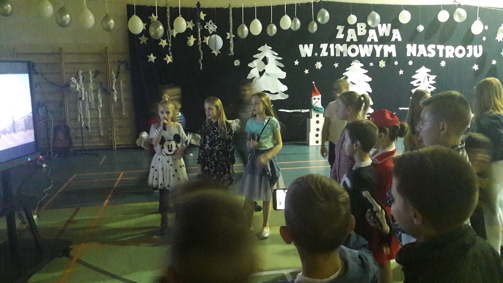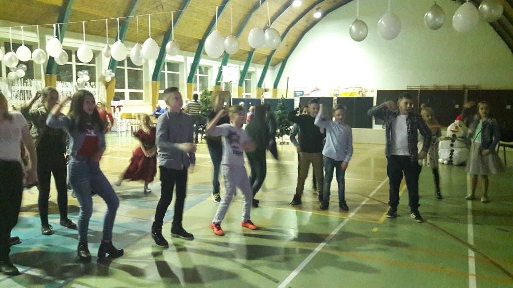 11 stycznia 2019r. w naszej szkole odbyła się huczna zabawa karnawałowa dla uczniów połączona z wizytą Mikołaja. Tego dnia sala gimnastyczna wyglądała inaczej niż na co dzień, zamieniła się bowiem w salę balową. Udekorowana białymi i srebrnymi balonami, z przeróżnymi bałwanami, zachęcała do szampańskiej zabawy. Społeczność szkolna bawiła się przy skocznej muzyce, którą trafnie dobrał nauczyciel muzyki Pan Andrzej Rydzewski. Podczas balu zostały przeprowadzone różne konkursy. Każdy uczeń mógł zaprezentować się w konkursie ,,Otwarty mikrofon” . Najbardziej do tańca porwała piosenka My3 ,,Mamaje” w wykonaniu Zuzanny, Marysi i Gabrysi z klasy III. Drugie miejsce zajęły Julka, Maja i Daria z klasy IV z utworem Moniki Lewczuk ,,Ty i ja”, natomiast trzecie miejsce wywalczyły piosenką Natalii Nykiel ,,Pół kroku stąd” uczennice klasy I Julka i Agata , którym towarzyszył Daniel z klasy V.