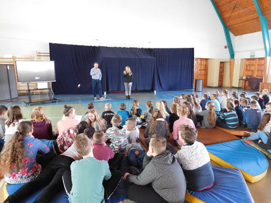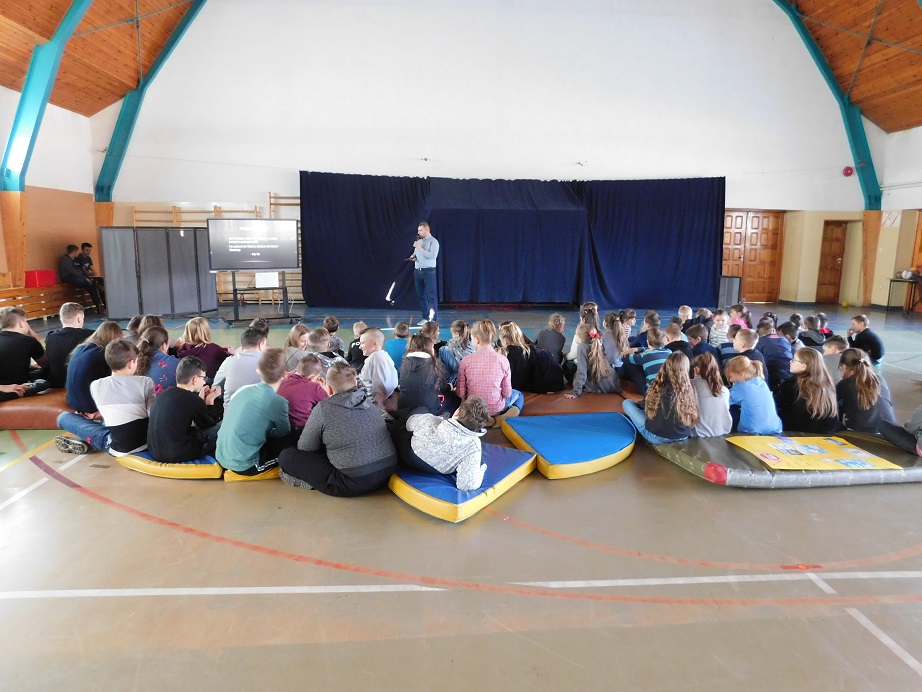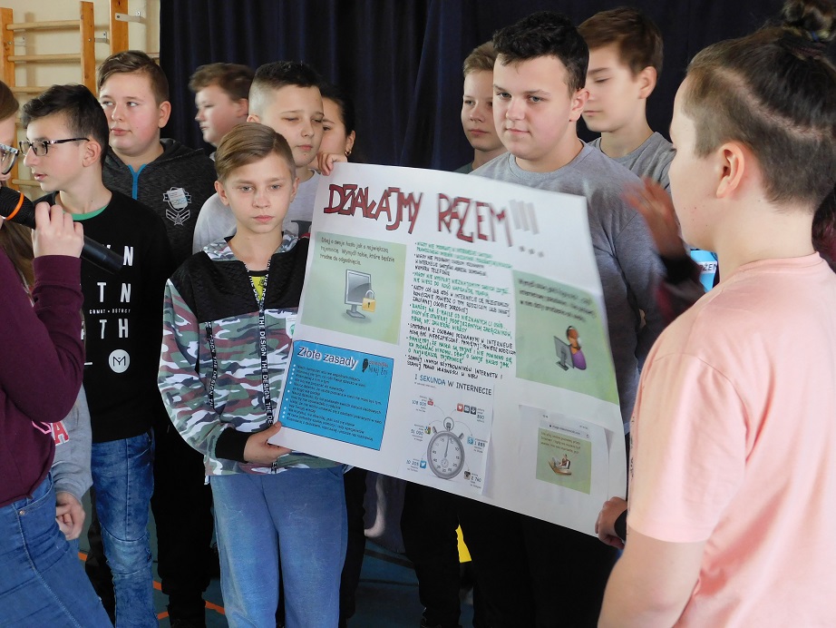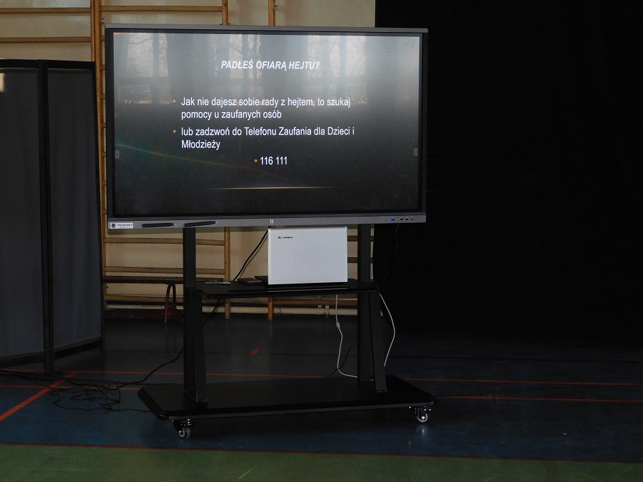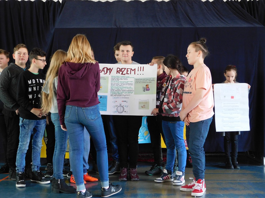 Po zajęciach z wychowawcą uczniowie uczestniczyli w prelekcji na temat hejtu w sieci, poprowadzoną przez Marcina Łęta- nauczyciela informatyki, następnie zaprezentowali wykonane przez siebie plakaty pt. „Działajmy Razem”. Najbardziej zaciekawiła uczniów możliwość wzięcia udziału w teście z wykorzystaniem aplikacji Kahoot, dzięki której mogli udzielać odpowiedzi przez telefon.