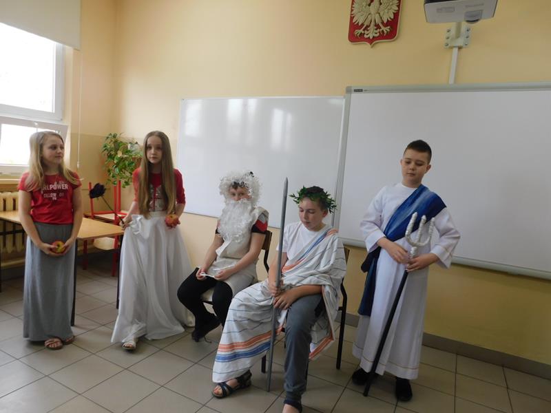 Na jednej z lekcji języka polskiego piątoklasiści wcielili się w mitologiczne postacie. Wszechwładny Zeus panował na Olimpie w towarzystwie pięknych bogiń – Afrodyty. Ateny i Hery i potężnych bogów – Posejdona, Hadesa, Hefajstosa. Uczniowie przygotowali wspaniałe stroje i pieczołowicie wykonane atrybuty swej władzy. Zaprezentowali się przed klasą, opowiadając o swoich niezwykłych umiejętnościach i wyczynach.