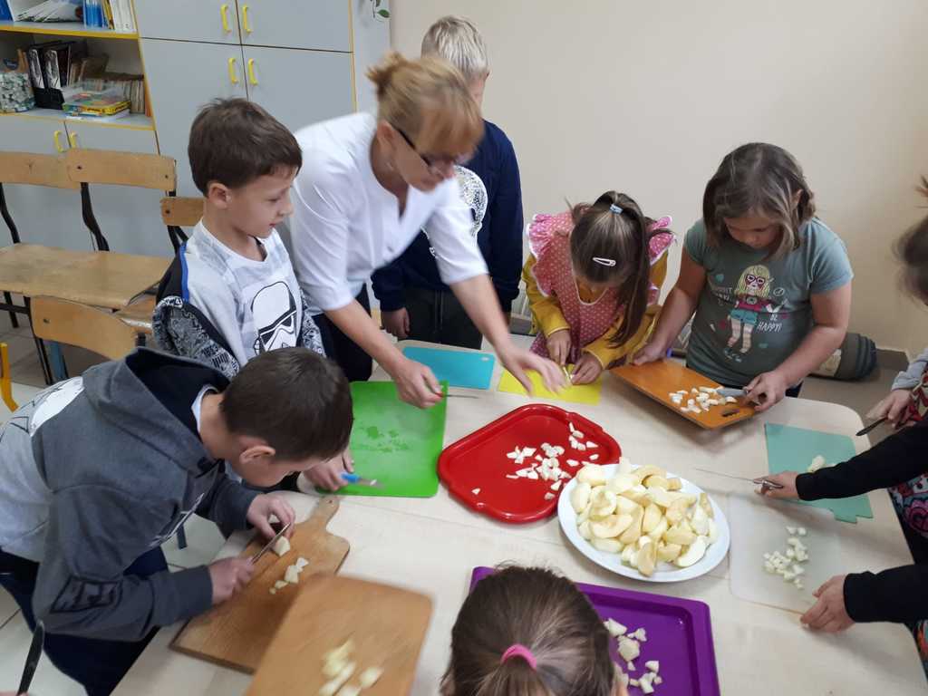Najmłodsi uczniowie wraz z bohaterami – Olą i Stasiem z Narodowego Centrum Edukacji Żywieniowej zapoznali się z piramidą zdrowego żywienia. Dietetyczka omówiła poszczególne stopnie piramidy oraz zwróciła uwagę na nowości w bocznym filarze piramidy a mianowicie: na sen, dbanie o higienę jamy ustnej oraz ograniczenie korzystania z urządzeń elektronicznych. Wspólnie przygotowano owsiankę z prażonymi jabłkami z dodatkiem orzechów, nasion i cynamonu. Po prostu – PYCHA!