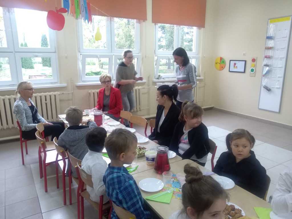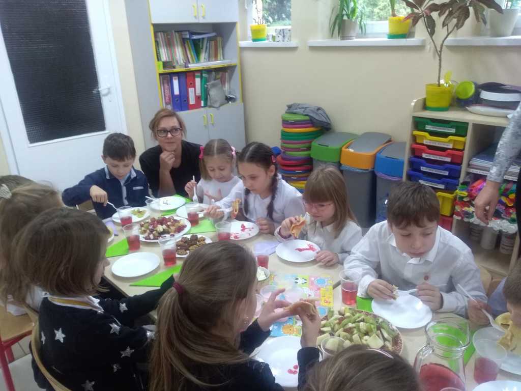W tym dniu wychowawcy z uczniami zorganizowali wspólne śniadanie. Dzieci wraz z zaproszonymi do współpracy rodzicami przygotowały z przyniesionych z domu produktów pyszne, owocowe koreczki, różne mleczne potrawy, pożywne ciasteczka, które później skonsumowały z apetytem.