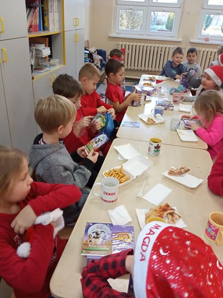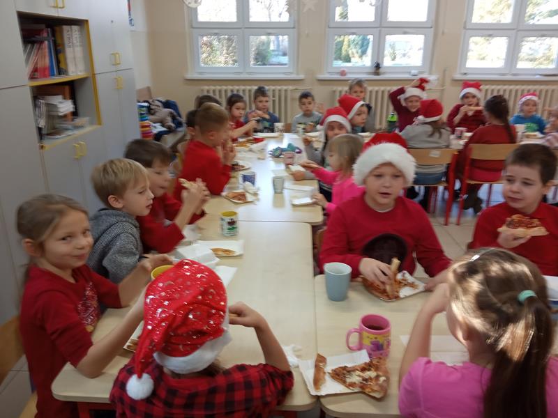 Po powrocie do szkoły uczniowie zgromadzili się na integracyjnym spotkaniu przy pysznej pizzy. Na najmłodszych czkała także słodka niespodzianka od Mikołaja.