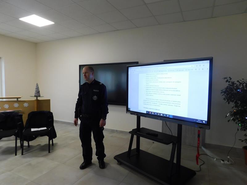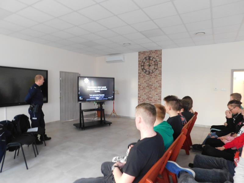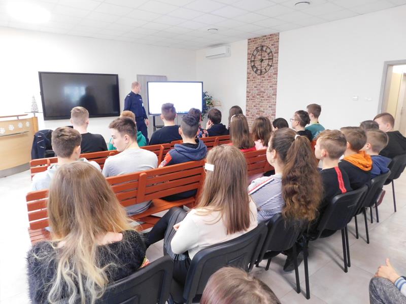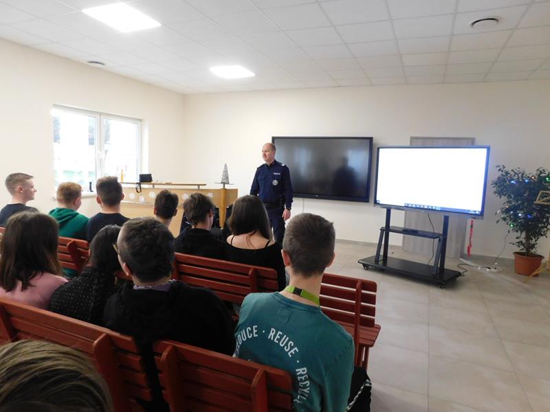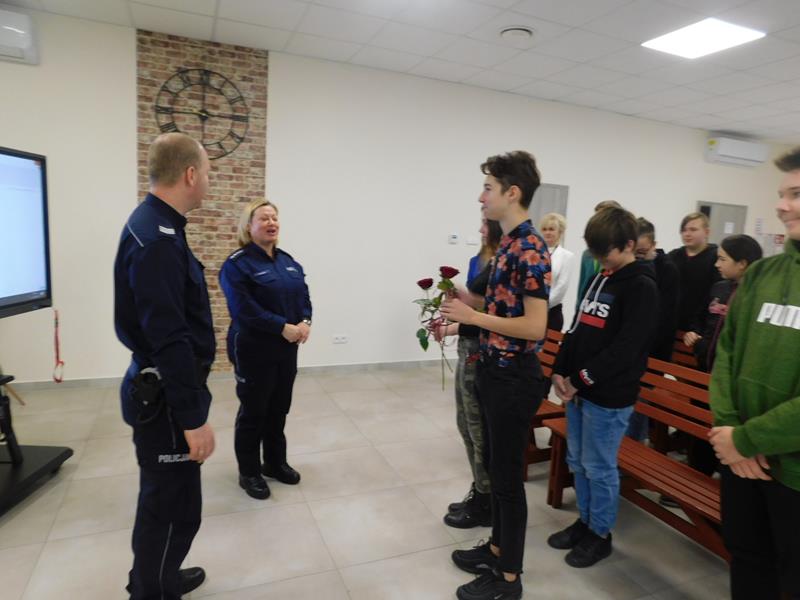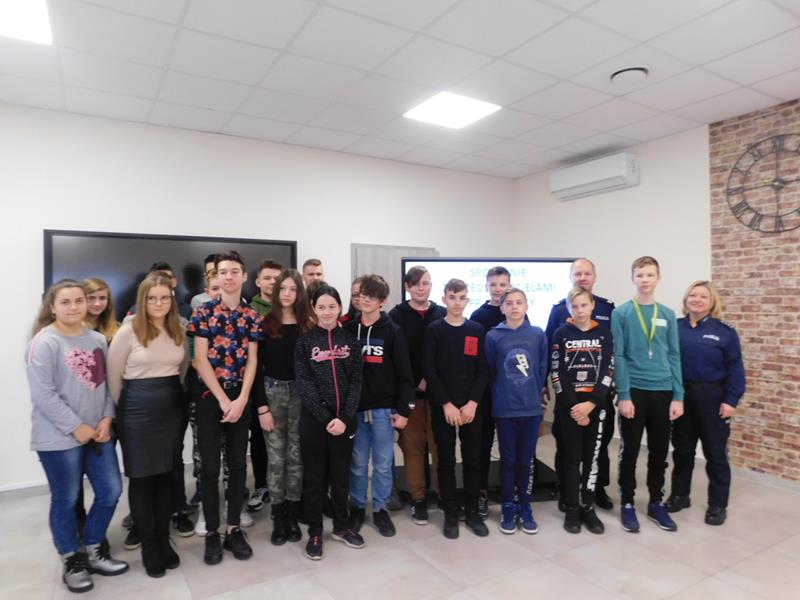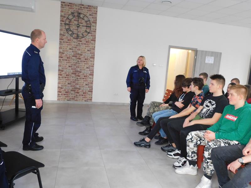 10 grudnia odbyło się niecodzienne spotkanie. Policjanci z Powiatowej Komendy Policji w Słupcy: aspirant sztabowy Marlena Kukawka i sierżant sztabowy Marcin Dębowski zapoznali uczniów klasy VII i VIII z charakterystyką pracy w Policji. Przybliżyli młodzieży, jak wygląda policyjna służba oraz poinformowali o etapach rekrutacji i kryteriach, jakie musi spełnić przyszły kandydat na policjanta. Przedstawili również możliwości rozwoju oraz kształcenia się w szkołach policyjnych. Zaprezentowali także filmy pokazujące przebieg testu sprawności fizycznej oraz działania różnych formacji policji.