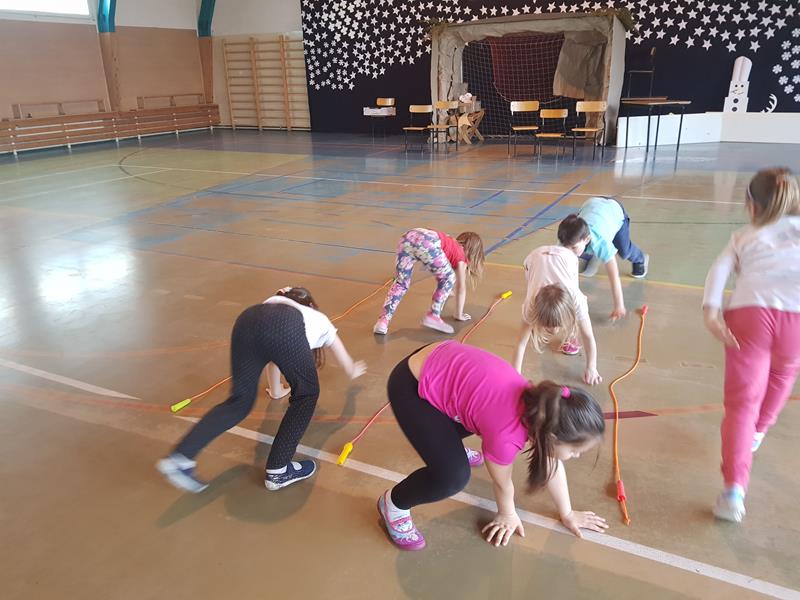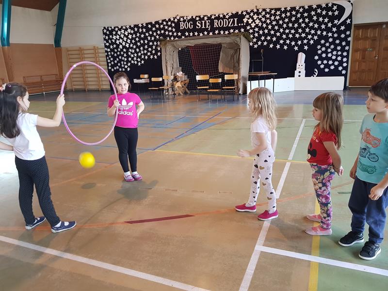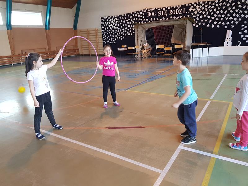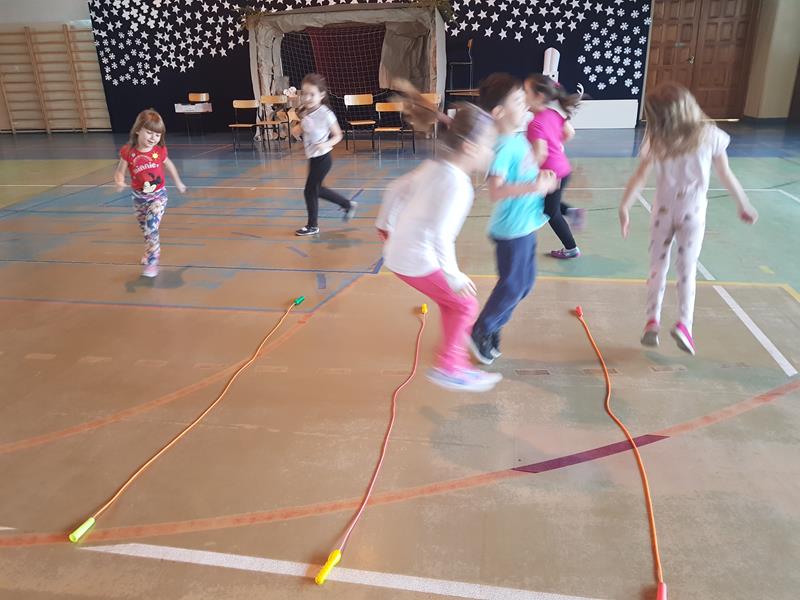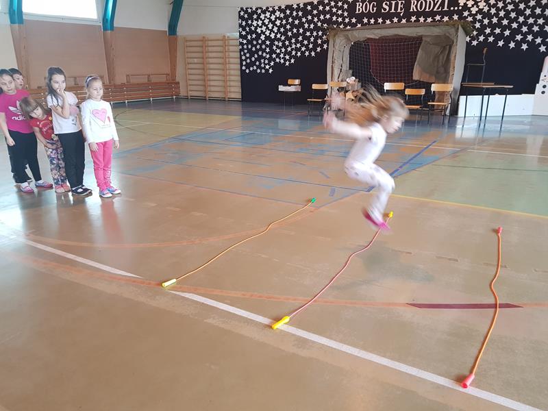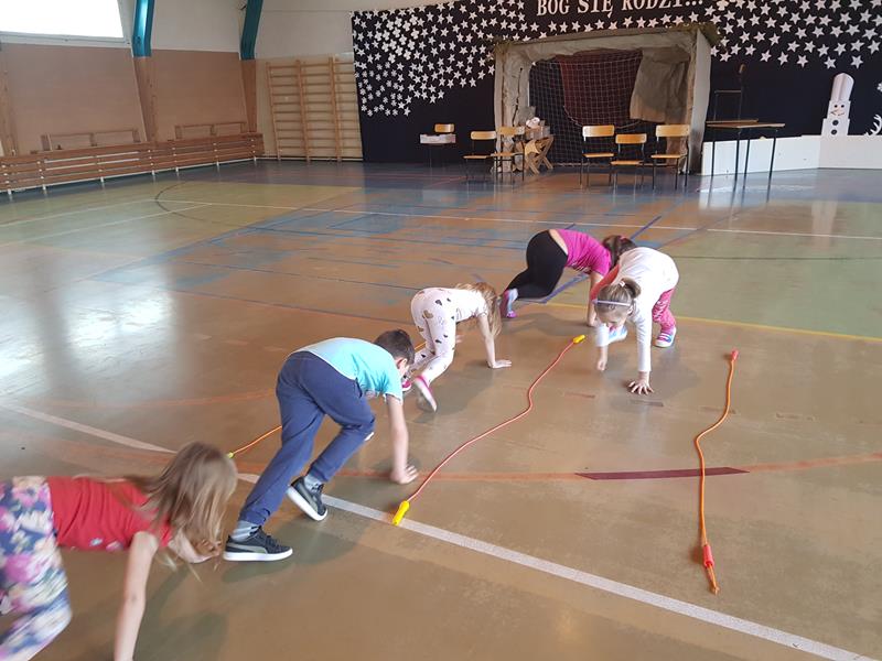 Oto kolejne zabawy na sportowo. Tym razem bawimy się pod hasłem: ,,Pomocnicy Świętego Mikołaja". Dzieci wcielają się w renifery Świętego Mikołaja. Ćwiczą, by być jak najlepiej przygotowane do czekających je zadań. Pokonują tory przeszkód, bokiem, przodem, skosami, slalomem, galopują, by jak najszybciej pędzić saniami. Praca w zaprzęgu dla Świętego Mikołaja nie należy do łatwych. Małe Elfy ćwiczą ładowanie prezentów i przerzucanie je przez komin. Dzieci uwielbiają takie zabawy.