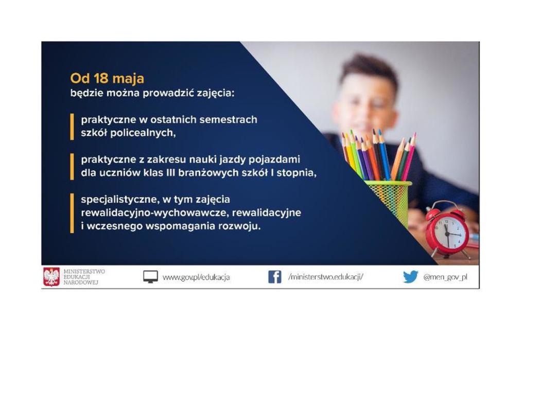 Od poniedziałku, 18 maja br. uruchamiamy kolejne etapy stopniowego powrotu do stacjonarnego funkcjonowania szkół, wybranych placówek oświatowych, bezpośredniego prowadzenia zajęć specjalistycznych z dziećmi posiadającymi opinię o potrzebie wczesnego wspomagania rozwoju i uczniami posiadającymi orzeczenie. Przywracamy również możliwość prowadzenia wybranych zajęć praktycznych w szkolnictwie branżowym. W kolejnych tygodniach przywrócimy zajęcia w klasach I-III szkoły podstawowej, umożliwimy realizację praktyk zawodowych u pracodawców w klasach III technikum oraz prowadzenie w szkołach konsultacji dla uczniów klas VIII szkoły podstawowej i absolwentów szkół ponadpodstawowych przygotowujących się do egzaminów, następnie dla uczniów wszystkich pozostałych klas ze szkół dla dzieci i młodzieży.