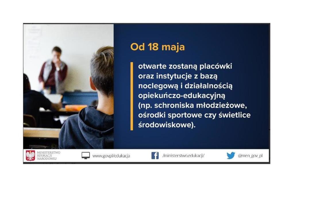 Otwarte będą schroniska młodzieżowe i międzyszkolne ośrodki sportowe. Do funkcjonowania w trybie stacjonarnym wracają placówki, które organizują pozaszkolne zajęcia rozwijające zainteresowania uczniów. Mowa tu o młodzieżowych domach kultury, pałacach młodzieży, ogniskach pracy pozaszkolnej oraz placówkach specjalistycznych.