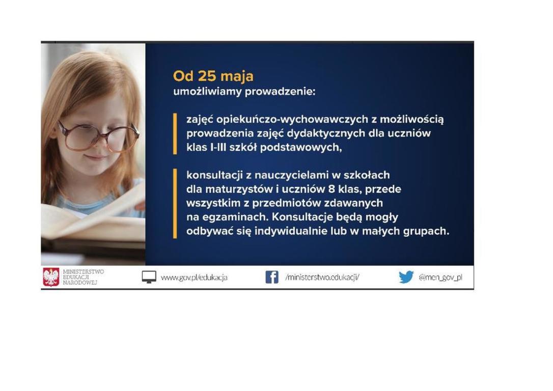 Od 25 maja br. przywracamy zajęcia opiekuńczo-wychowawcze z możliwością prowadzenia zajęć dydaktycznych dla uczniów klas I-III szkół podstawowych. Utrzymujemy obowiązek realizowania podstawy programowej. W zależności od sytuacji w danej szkole dyrektor zdecyduje czy będzie to kształcenie w formie stacjonarnej, czy z wykorzystaniem metod i technik kształcenia na odległość.