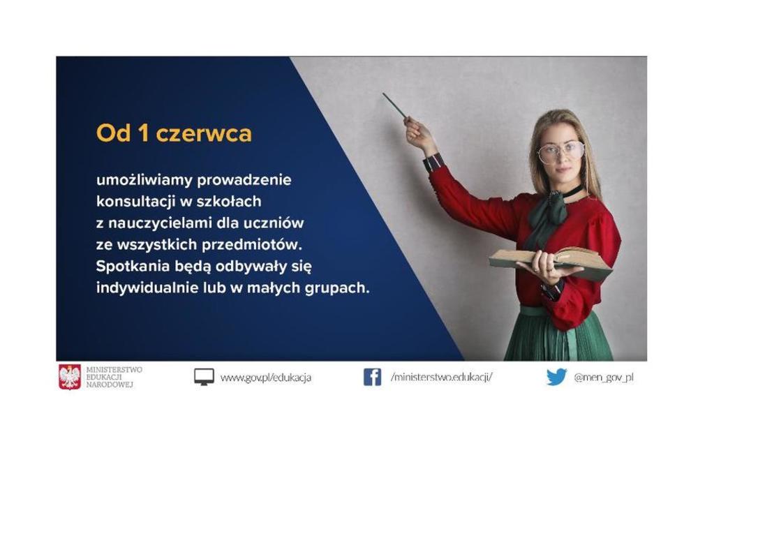 Od 1 czerwca br. uczniowie pozostałych klas ze szkół dla dzieci i młodzieży będą mieli możliwość korzystania z konsultacji ze wszystkich przedmiotów na terenie szkoły. Wymiar tych konsultacji zostanie uzależniony od potrzeb ucznia, a także warunków szkoły. Konsultacje będą dobrowolne dla ucznia, natomiast dyrektor szkoły będzie zobowiązany je zorganizować, biorąc pod uwagę możliwości szkoły.