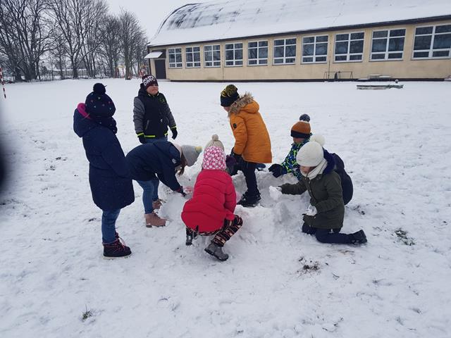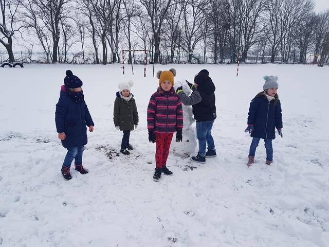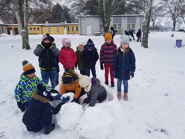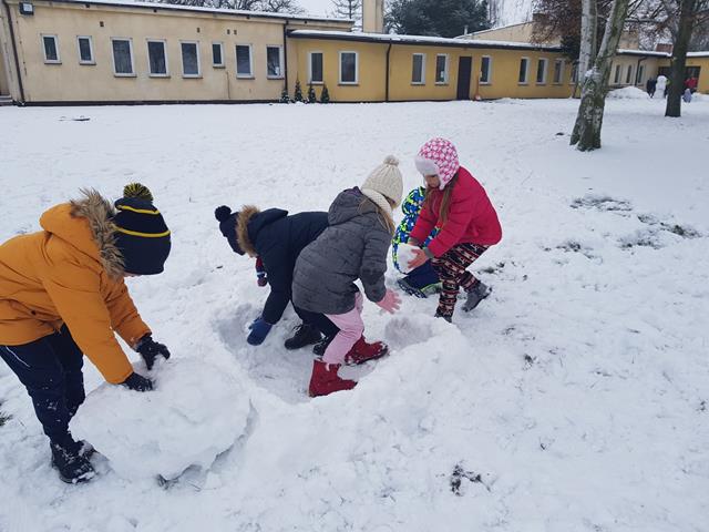 Dzieci współpracując że sobą, z wielką ochotą zabrały się do lepienia bałwana. Część dzieci z wytrwałością budowała lodowe igloo. Śmiechom i harcom nie było końca.
