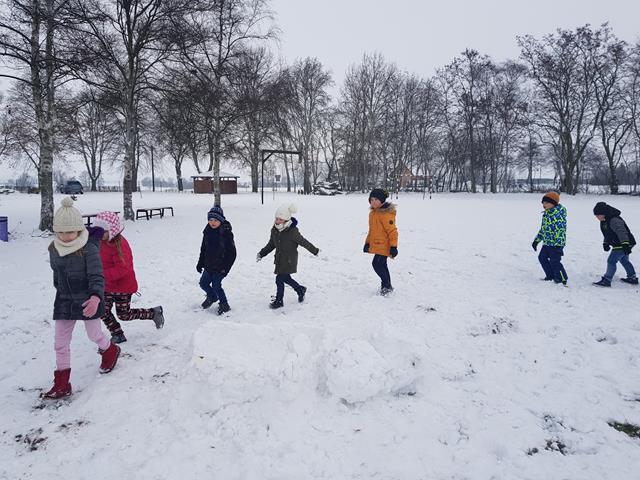Odbył się również konkurs lepienia śnieżnych kul,  które posłużyły do  walki na śnieżki. Kolejna zabawa to przekazywanie sobie wielkiej śniegowe kuli dokładnie i starannie tak, by nie uległa zniszczeniu. Zimowy tor przeszkód również okazał się wielką frajdą. Dzieci przeskakiwały lub omijały slalomem wykonane przez siebie śnieżne przeszkody.