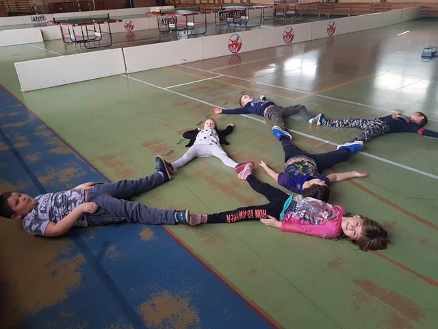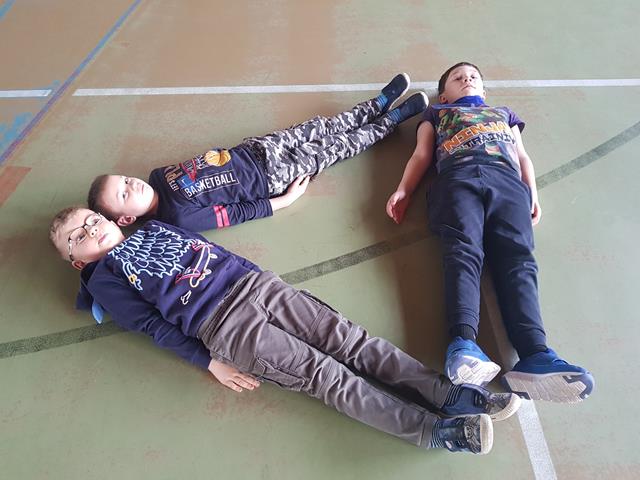 Podczas kolejnej zabawy dzieci na dany sygnał przybierały taką postawę by przedstawiała określoną figurę. Na dane hasło miały zbudować z siebie określoną figurę, mogły ustawić swoje ręce w odpowiedni sposób, mogły się położyć na podłodze ,itp. Pomysłów było wiele.