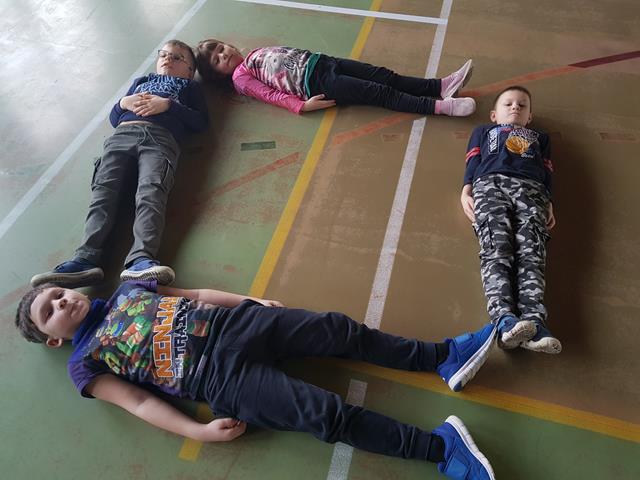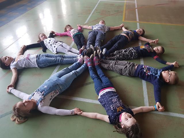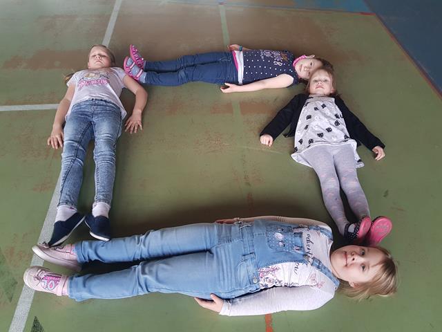 W kolejnym zadaniu dzieci zostały podzielone na zespoły. Zadaniem każdego zespołu było ułożenie kształtów figur z własnych ciał.