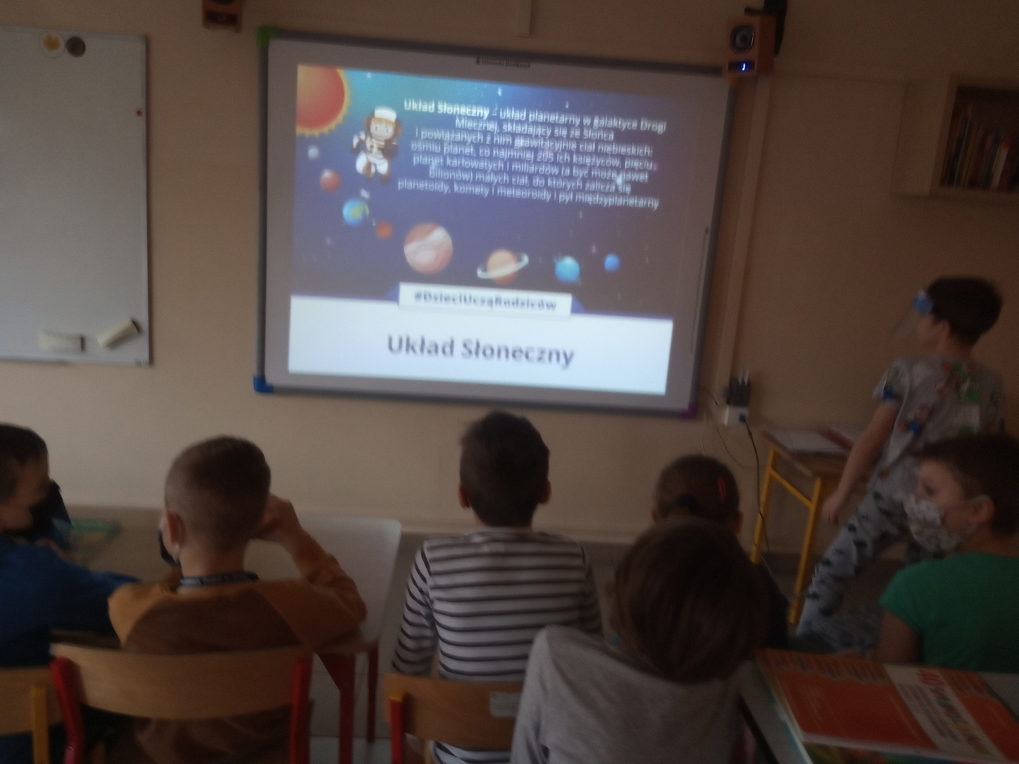 Za nami kolejna już lekcja w ramach ogólnopolskiej akcji „Dzieci uczą rodziców”. Tym razem uczniowie uczestniczyli w ,,Kosmicznej przygodzie”. Podczas zajęć obejrzeli ciekawą prezentację multimedialną, która wyjaśniła im pojęcie ,,Kosmosu i wszechświata”. Dowiedzieli się również, czym jest ,,droga mleczna".
