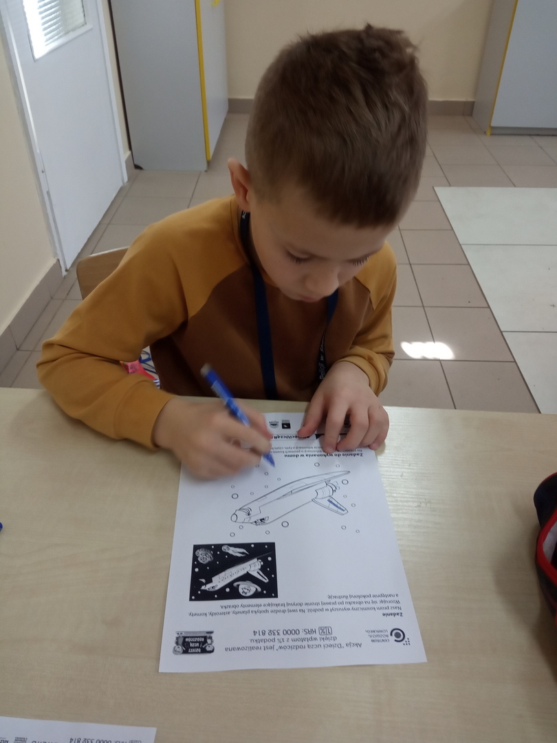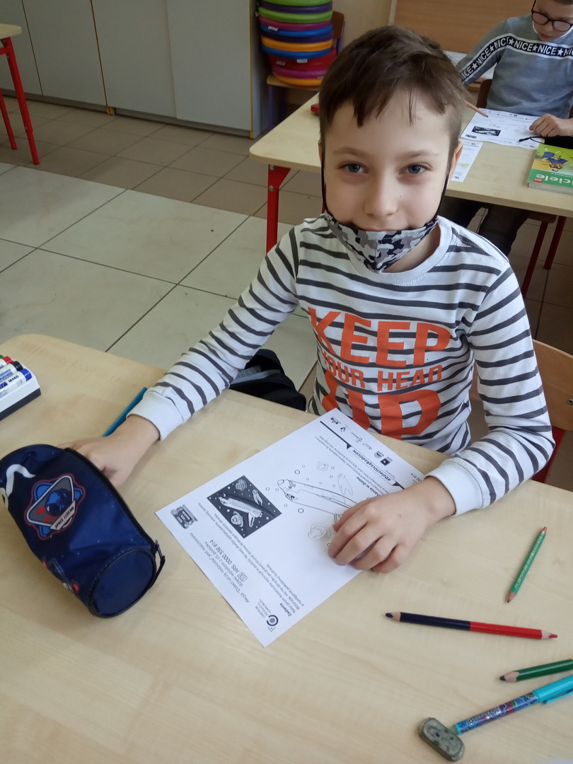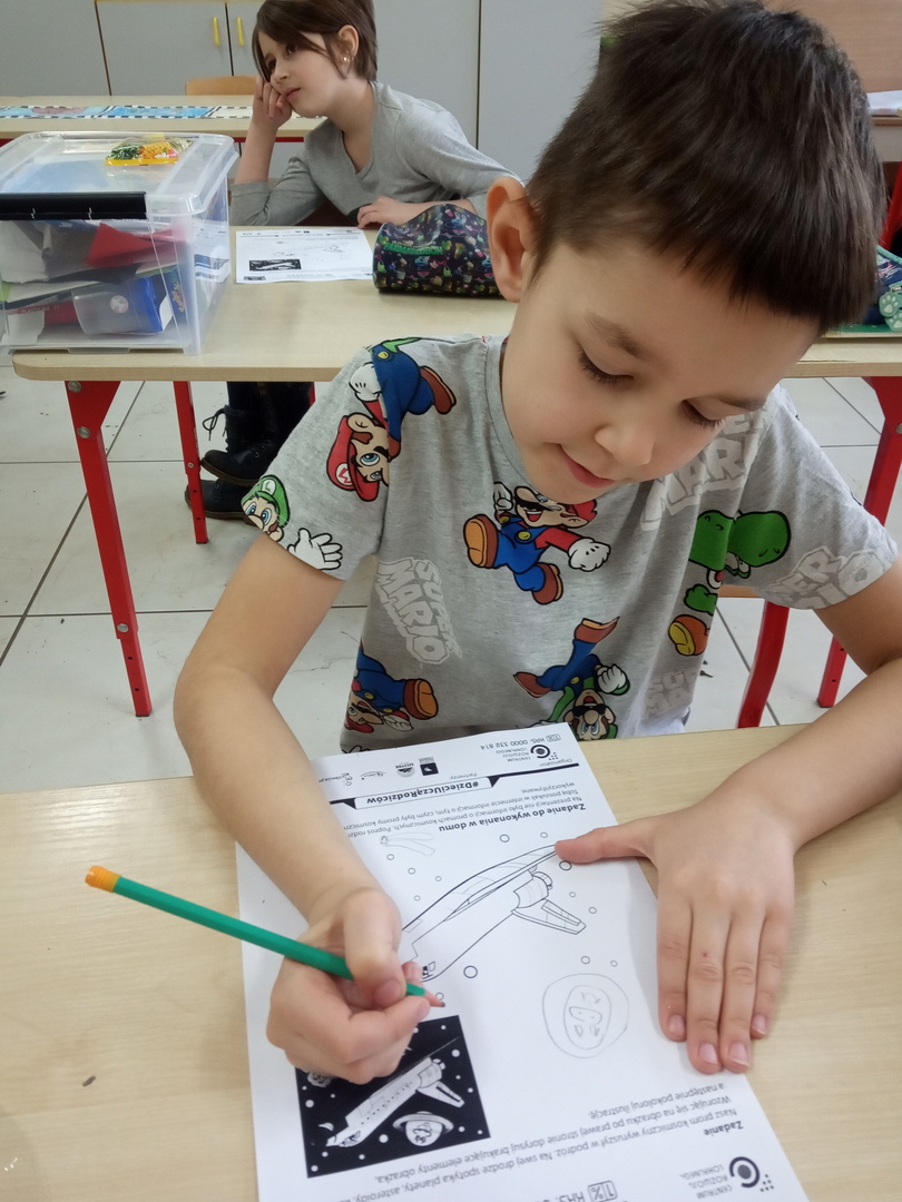 Uczniowie wykonali cztery zadania rysunkowe poświęcone planetom oraz wizji kosmicznego domu. Doskonalili swoją spostrzegawczość oraz pamięć. Zdobytymi wiadomościami podzielili się w domu i z rodzicami znakomicie zaliczyli ostatnie .