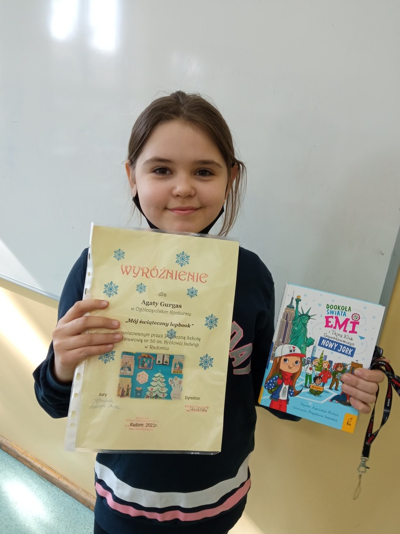 Uczennica klasy III, Agata Gurgas w okresie świątecznym brała udział w Ogólnopolskim Konkursie organizowanym przez Publiczną Szkołę Podstawową nr 30 im. Królowej Jadwigi w Radomiu. Zadanie konkursowe polegało na stworzeniu lapbooka o Świętach Bożego Narodzenia. Lapbook, czyli w dosłownym tłumaczeniu „książka na kolanach”, najczęściej przybiera formę teczki tematycznej, w której w kreatywny sposób umieszcza się informacje na dany temat. Praca Agaty została doceniona przez jury konkursowe. Uczennica otrzymała dylpom oraz książkę. Gratulujemy!