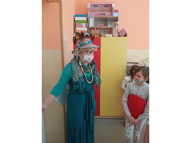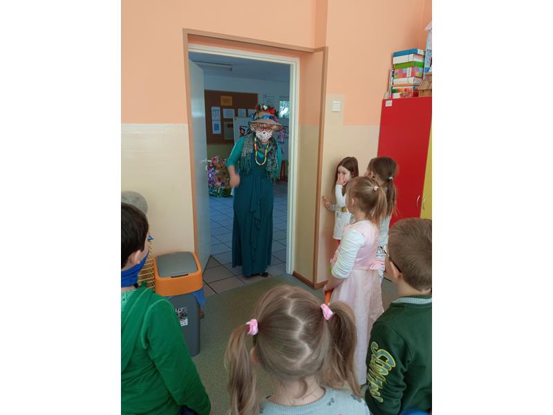 O godzinie 10.15 na zajęcia przybyła Zielona Pani Wiosna. Dzieci zabawnym wierszykiem pożegnały Marzannę – symbol Zimy. Nikomu chyba nie było smutno z tego powodu, bo pojawienie nowej pory roku już budziło ożywienie i ciekawość.