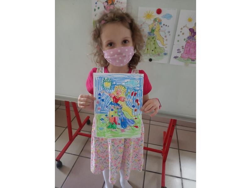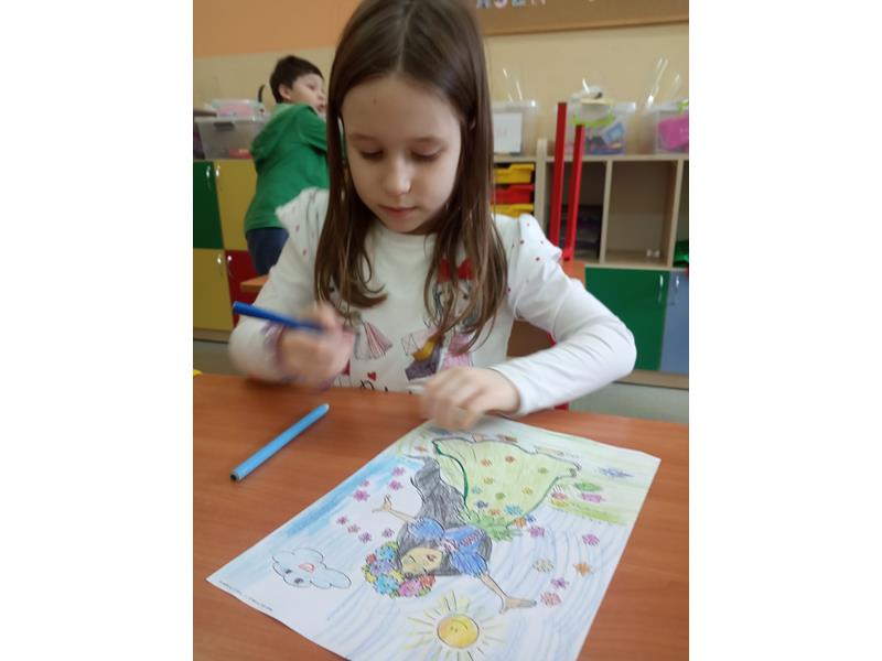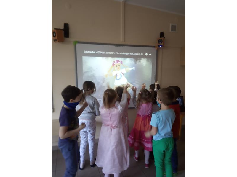 Pani Wiosna oświadczyła, że od dziś zaczyna swoje panowanie w przyrodzie i pogodzie. Zaprosiła dzieci do wspólnego oglądania filmu edukacyjnego ,,Zwiastuny wiosny”, w którym zaprezentowała pierwsze wiosenne kwiaty, ptaki. Maluchy rozwiązywały wiosenne zagadki, poznały wesołe rymowanki, radośnie bawiły się przy dźwiękach piosenek. Dzieci wykonały także kolorowe Gaiki. Na zakończenie zajęć zaprojektowały sukienkę dla Pani Wiosny.