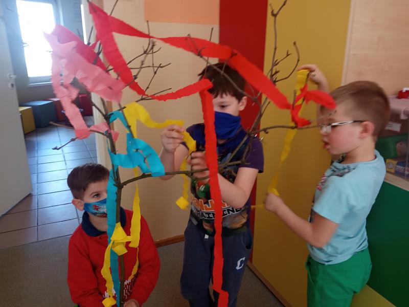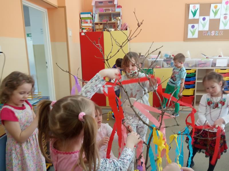 Od samego rana dzieci z wielkim zaangażowaniem pomagały w wykonaniu kukły Marzanny. Podczas pracy dowiedziały się, kim w ogóle jest Marzanna i co ma ona symbolizować? Kukłę Marzanny maluchy wykonały ze szarego worka i przyozdobiły kolorowymi paskami bibuły. Układały także historyjkę obrazkową dotyczącą obrzędu topienia Marzanny.