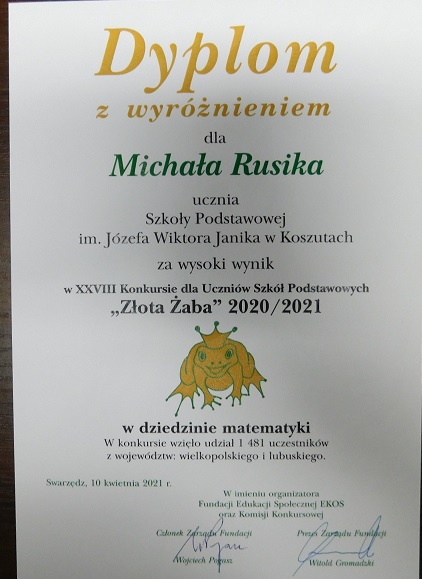 WYRÓŻNIENIE DLA MICHAŁA W KONKURSIE MATEMATYCZNYM „ZŁOTA ŻABA”!