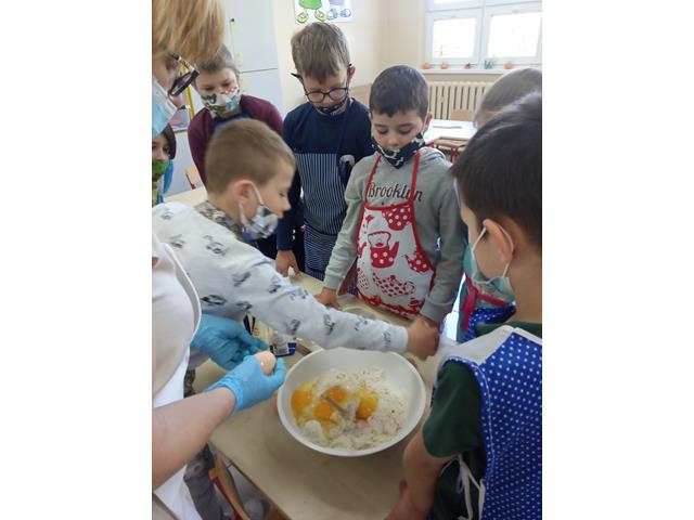 Zafascynowani, mali kucharze podwinęli rękawy i pod okiem wychowawczyni ochoczo zabrali się za pieczenie ciasta. Najpierw obrali ze skórki rabarbar i pokroili go na drobne kawałki. Następnie z wielkim zaangażowaniem odmierzali składniki i łączyli je zgodnie z przepisem. Gdy ciasto wypiekało się w piecu poszukiwali wiadomości o tej roślinie.