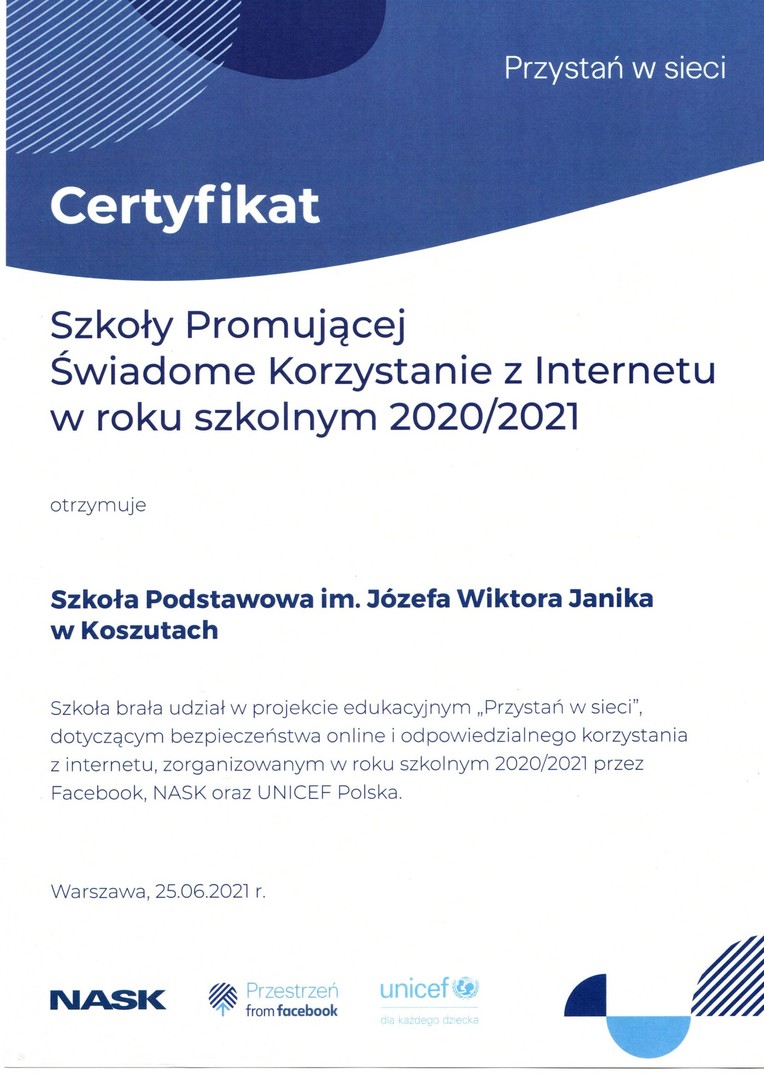 W roku szkolnym 2020/2021 nasza szkoła wzięła udział w projekcie edukacyjnym ,,Przystań w sieci”, dotyczącym bezpieczeństwa online i odpowiedzialnego korzystania z Internetu. Projekt został zorganizowany przez Facebook, NASK oraz UNICEF Polska oraz skierowany był zarówno dla uczniów jak i nauczycieli zajmujących się edukacją dzieci i młodzieży powyżej 13 roku życia.