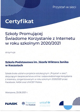CERTYFIKAT SZKOŁY PROMUJĄCEJ ŚWIADOME KORZYSTANIE Z INTERNETU