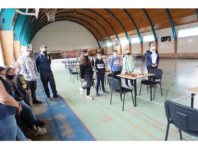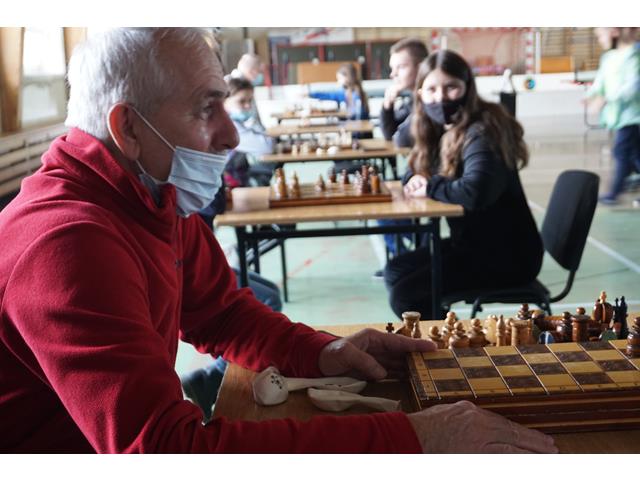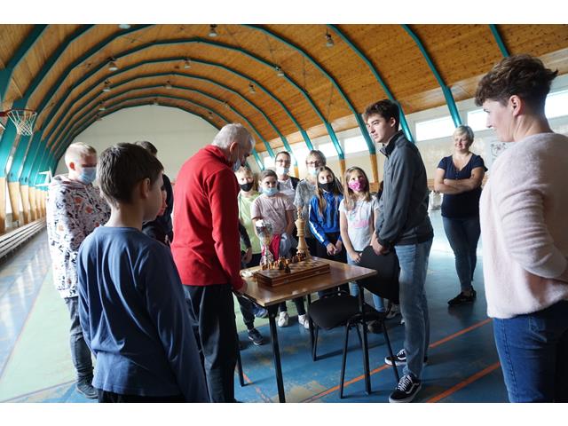 Amatorzy i miłośnicy gry byli bardzo ciekawi kariery gościa, zadali więc wiele pytań. Następnie uczeń klasy IV Dawid Ciesielski jako pierwszy podjął wyzwanie Mistrza. Wszyscy sądzili, że to będzie krótka rozgrywka, ale ku naszemu zdziwieniu nasz uczeń utrzymał się dość długo. Może po takiej rundzie jego zainteresowania pogłębią się i pójdzie