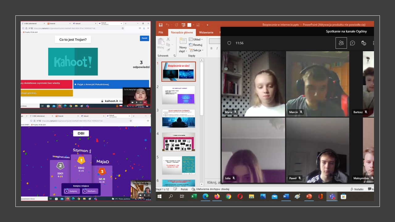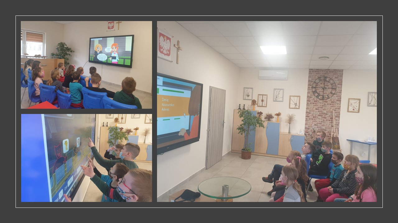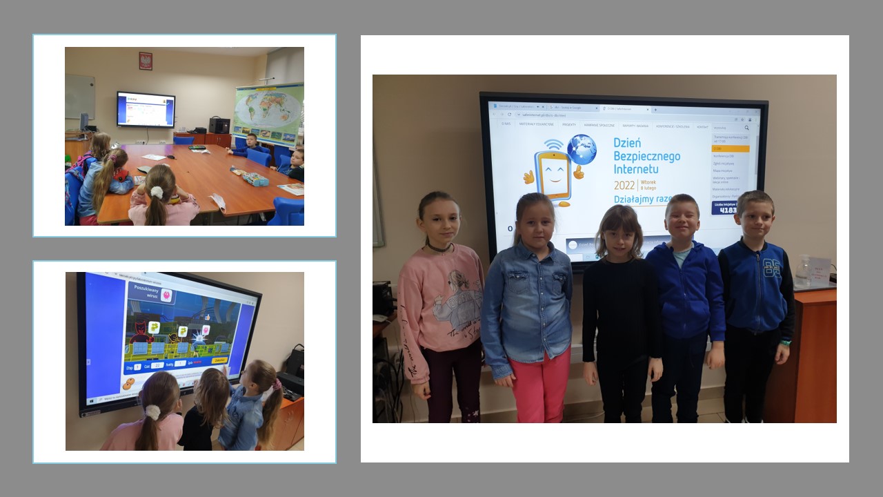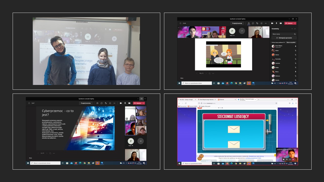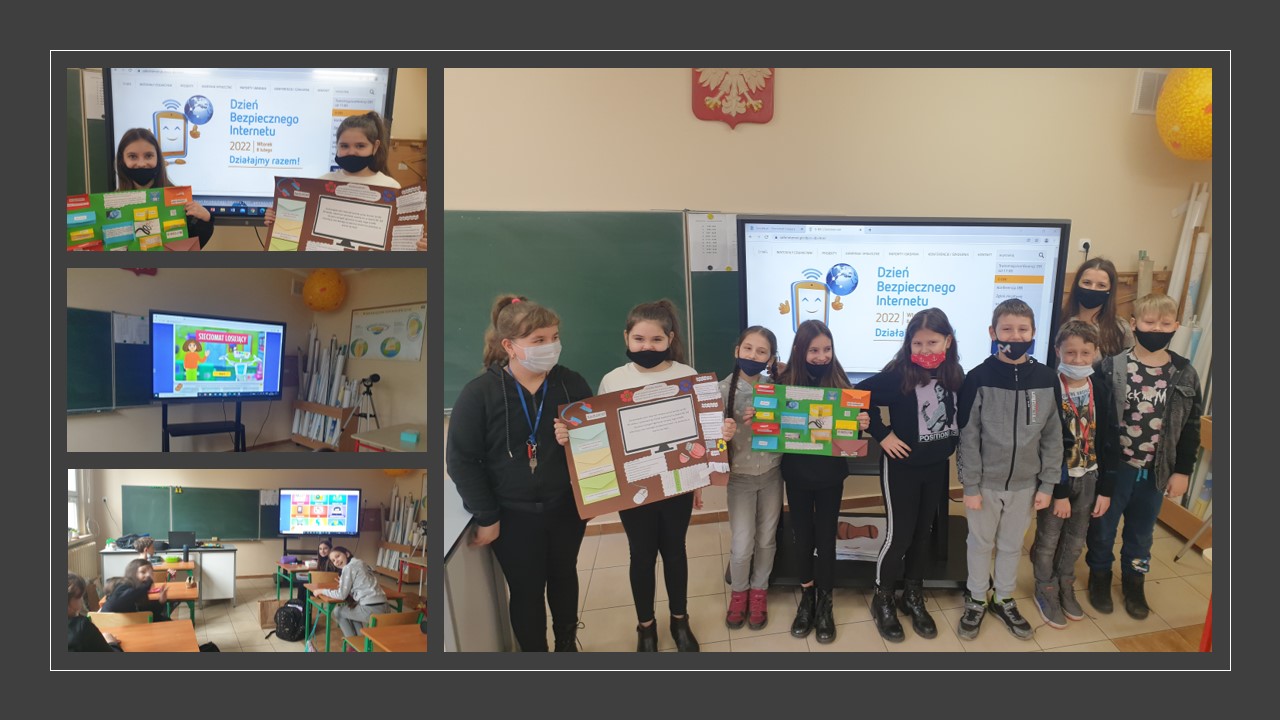Podczas zajęć z informatyki w klasach starszych zostały przeprowadzone pogadanki o zasadach zachowania w Internecie oraz bezpiecznego korzystania z niego, wykorzystując w tym celu prezentację przygotowaną przez uczniów oraz filmy edukacyjne. Po zakończonej prelekcji uczniowie wzięli udział w quizach, z wykorzystaniem aplikacji kahoot lub maszyny losującej z pytaniami. Młodzież z zaangażowaniem udzielała odpowiedzi na pytania z quizu, przy tym dobrze się bawiąc. Uczniowie podczas pracy w grupach, przygotowali egazetki opisujące zasady bezpieczeństwa w Internecie.