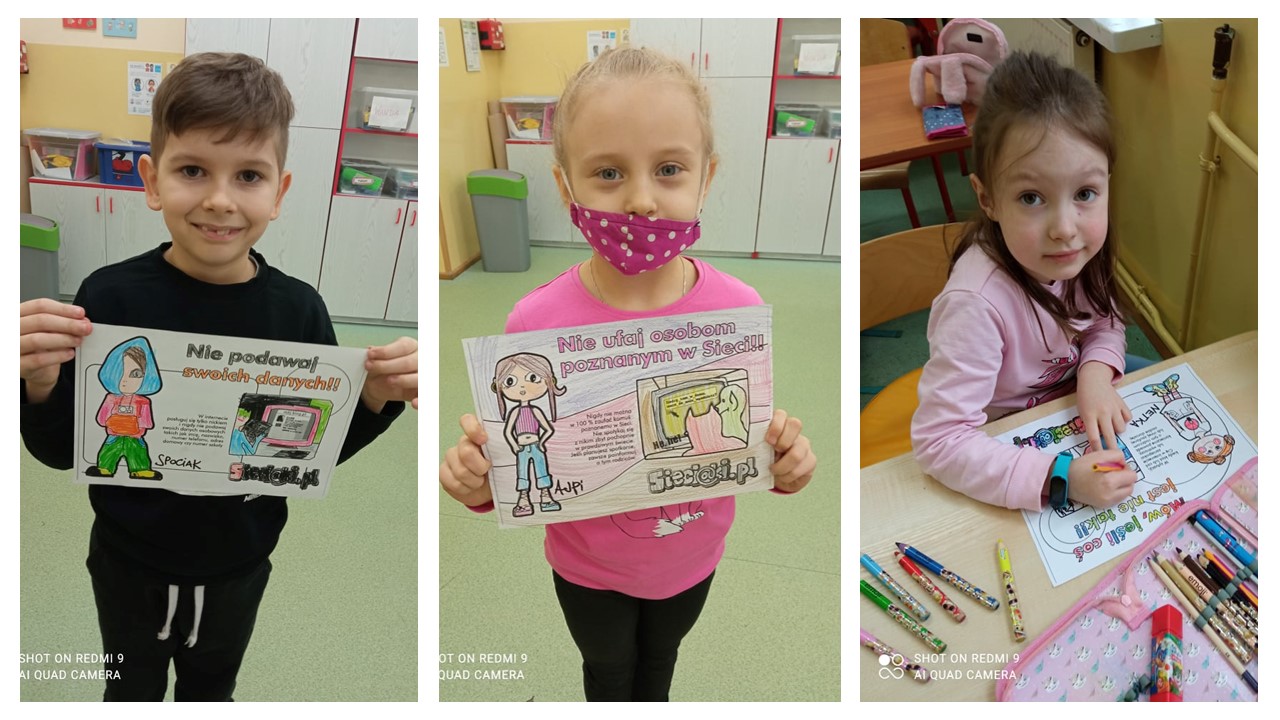 W tym roku najmłodsze dzieci z klas I-IV poznali drużynę sieciaków oraz sieciuchów. Razem z bohaterami przypomnieli sobie zasady bezpieczeństwa oraz porady jak być ostrożnym w sieci. Dzięki edukacyjnym filmikom poznali zagrożenia oraz dowiedzieli się jak na nie odpowiednio reagować. Dzieci podczas pogadanki dzieliły się podobnymi sytuacjami, jakie miały miejsce w ich otoczeniu. Najmłodsi zaprezentowali również swoje lapbooki, które przygotowały specjalnie na konkurs. Na zakończenie spotkania wzięli udział w grach edukacyjnych oraz udzielali odpowiedzi na wylosowane pytania. W ramach podsumowania pokolorowali swoich bohaterów z przesłaniem mówiącym, jak uniknąć zagrożeń w sieci.