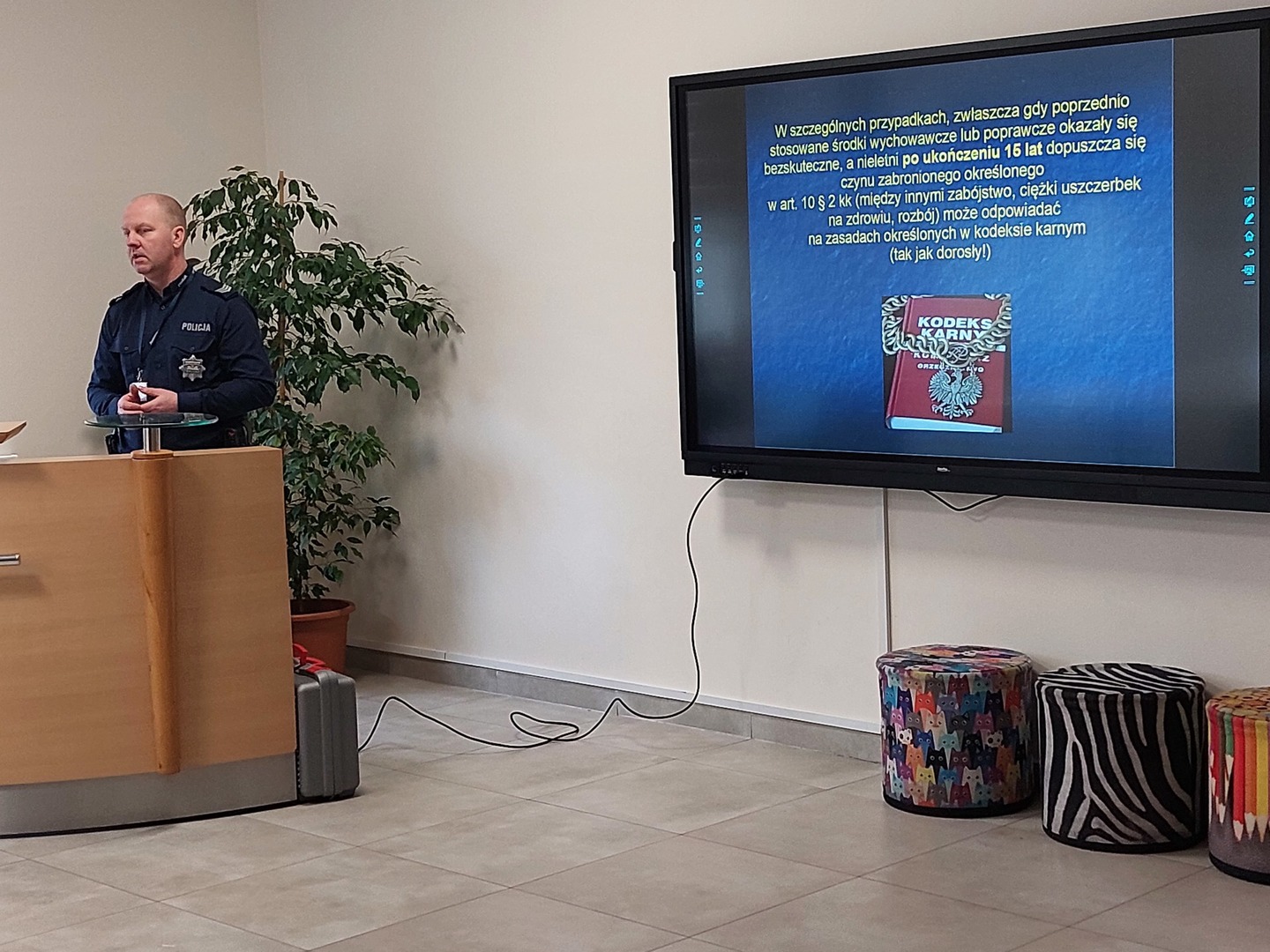 Drugie spotkanie przeznaczone było dla uczniów klas VI - VIII. Tematem pogadanki oprócz kwestii związanych z bezpieczeństwem w ruchu drogowym była odpowiedzialność prawna nieletnich za popełniane czyny, przemoc i agresję słowną wobec rówieśników i dorosłych.