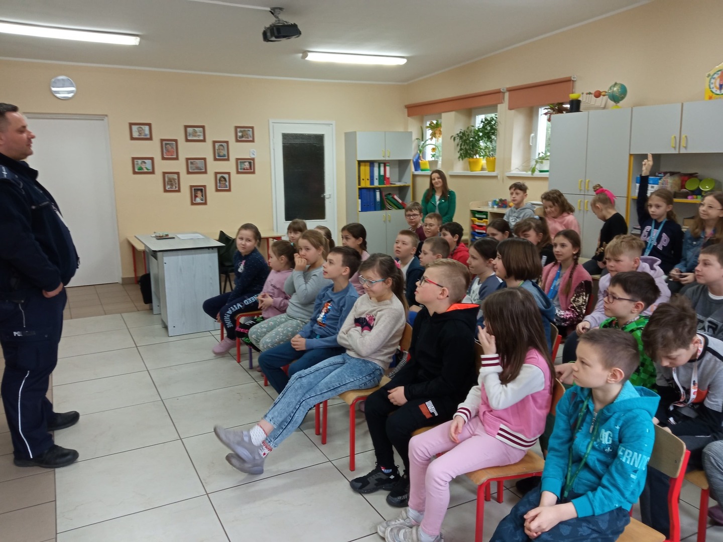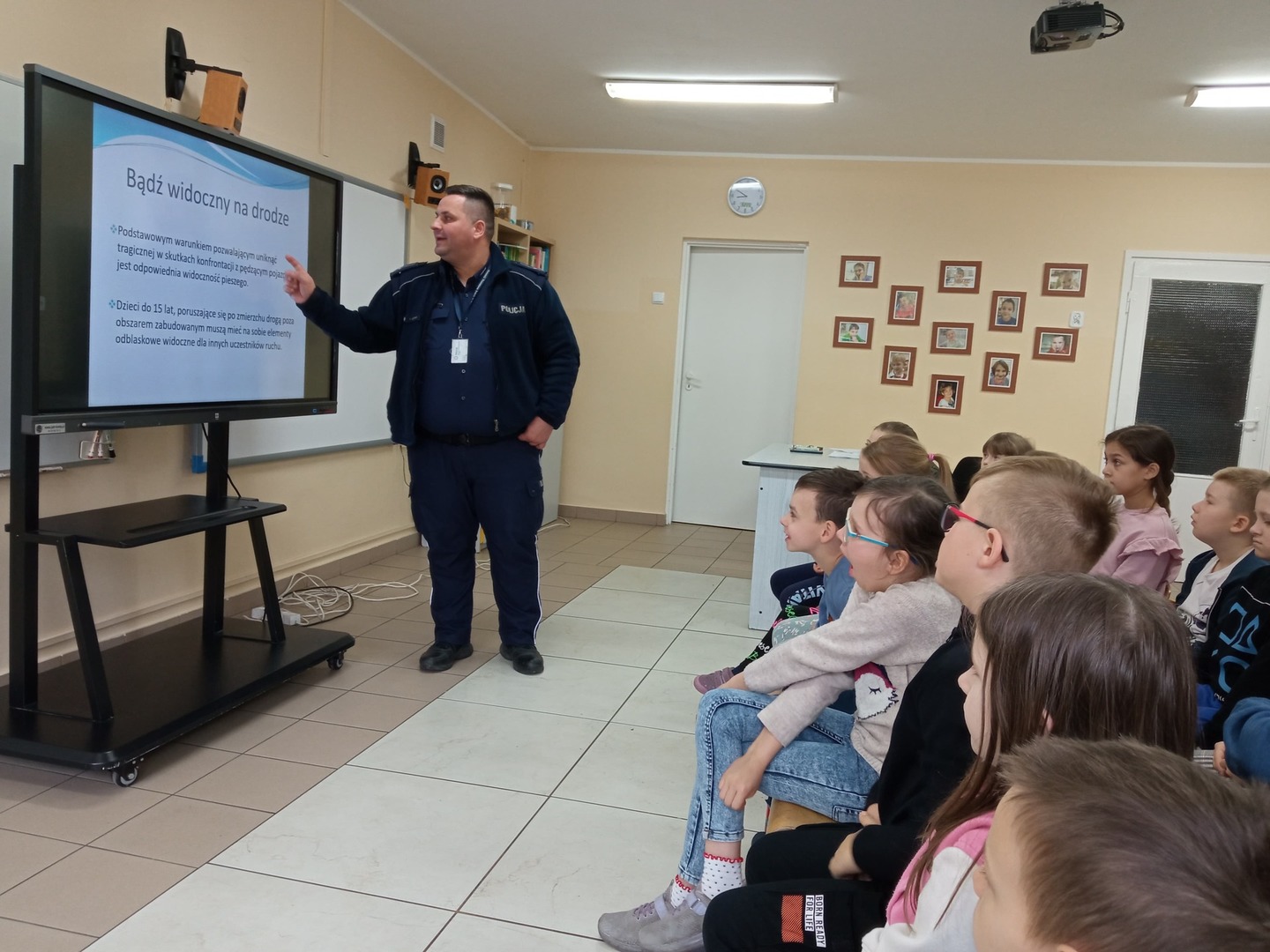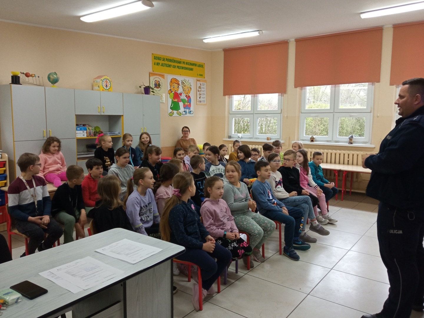 W klasach I - IV dzielnicowy młodszy aspirant Mateusz Jóźwiak przypomniał uczniom zasady dotyczące bezpieczeństwa w ruchu drogowym jako pieszy, rowerzysta a także pasażer w samochodzie. Podkreślił, jak ważną rolę pełnią elementy odblaskowe, które powinni nosić nie tylko piesi. Przypomniał uczniom numery telefonów alarmowych: na policję, do straży pożarnej i pogotowia ratunkowego. Zaproszony gość omówił także niebezpieczeństwa, jakie mogą czyhać na dzieci w kontaktach z obcymi czy zagrożenia wynikające z obcowania z nieznanymi zwierzętami.