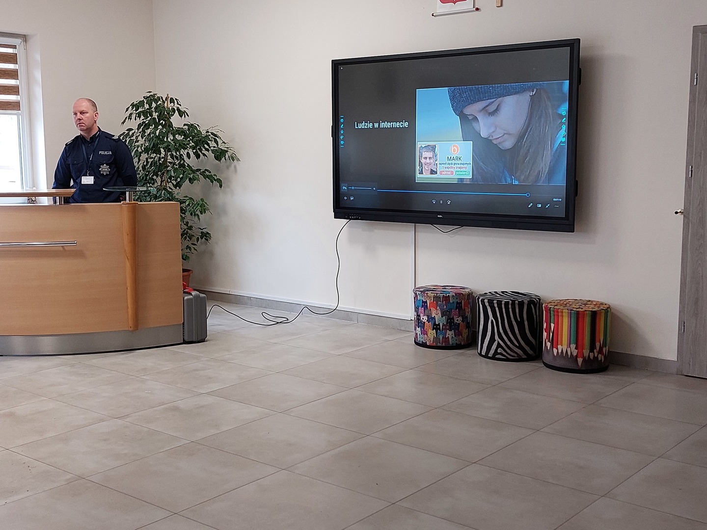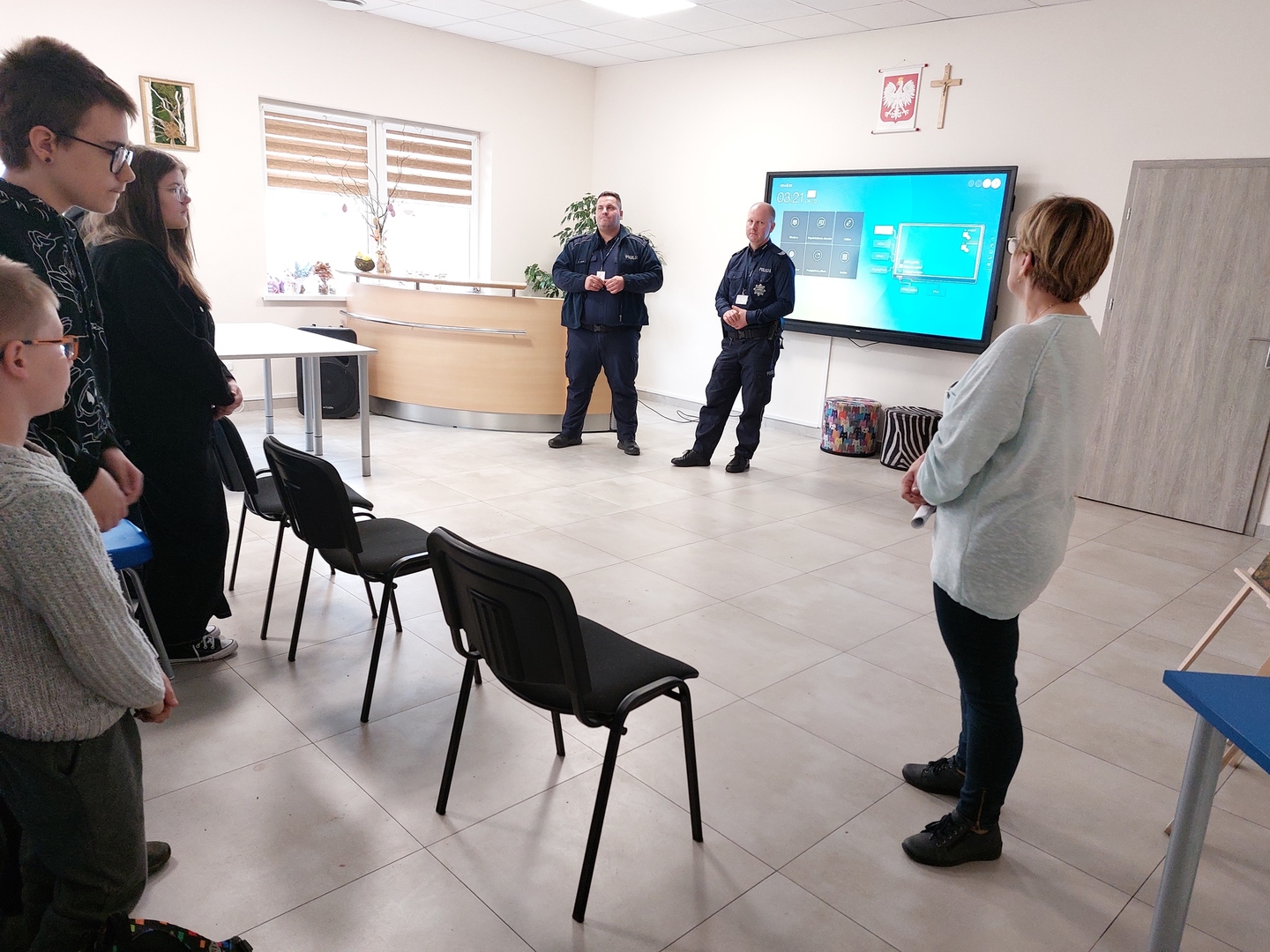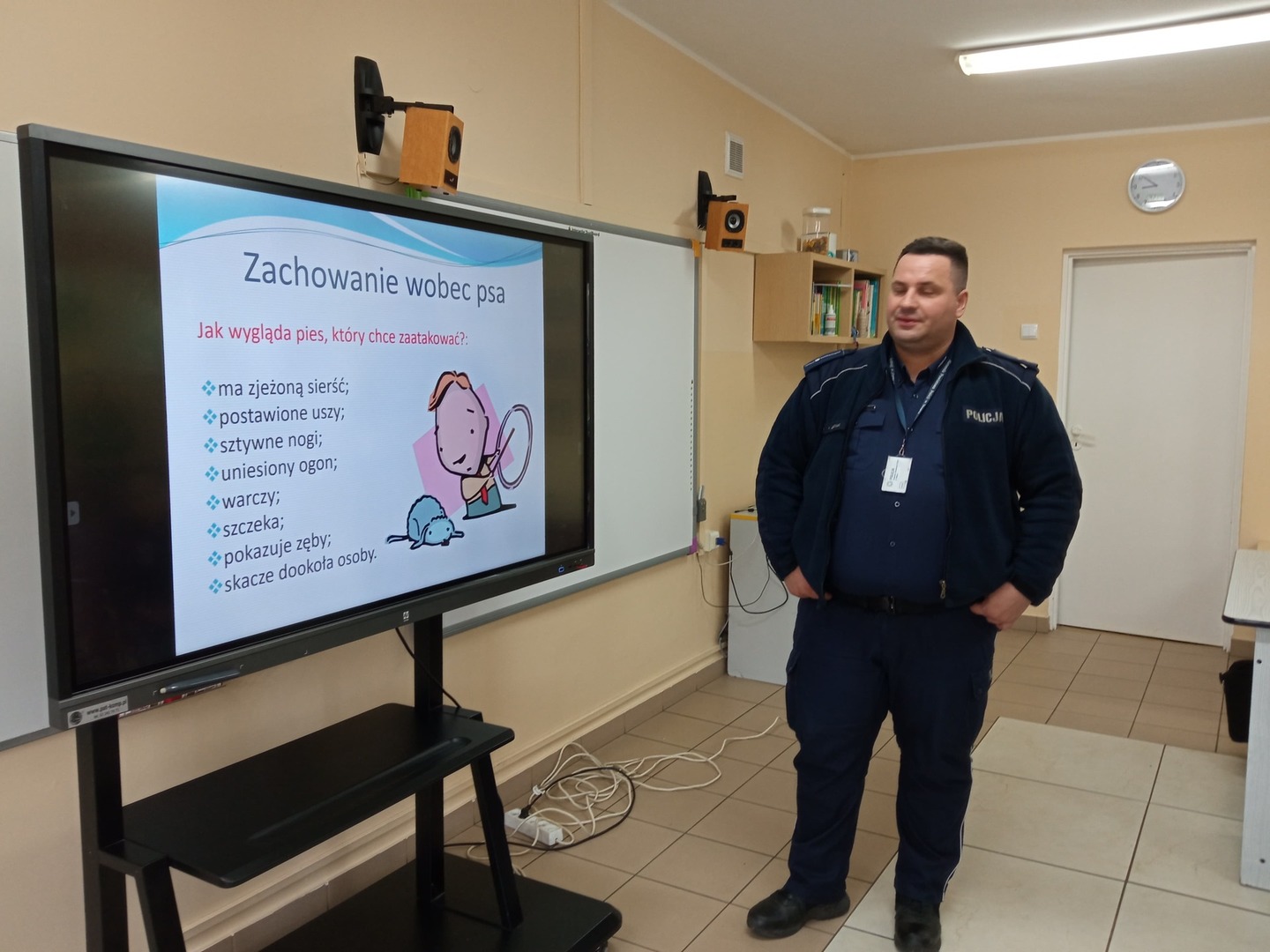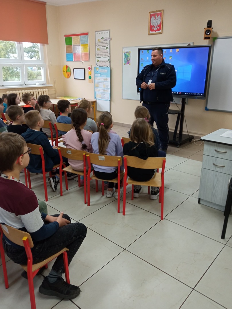 W klasach I - IV dzielnicowy młodszy aspirant Mateusz Jóźwiak przypomniał uczniom zasady dotyczące bezpieczeństwa w ruchu drogowym jako pieszy, rowerzysta a także pasażer w samochodzie. Podkreślił, jak ważną rolę pełnią elementy odblaskowe, które powinni nosić nie tylko piesi. Przypomniał uczniom numery telefonów alarmowych: na policję, do straży pożarnej i pogotowia ratunkowego. Zaproszony gość omówił także niebezpieczeństwa, jakie mogą czyhać na dzieci w kontaktach z obcymi czy zagrożenia wynikające z obcowania z nieznanymi zwierzętami.