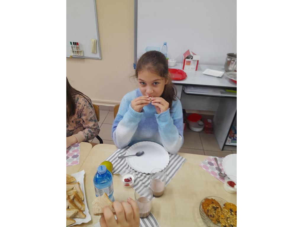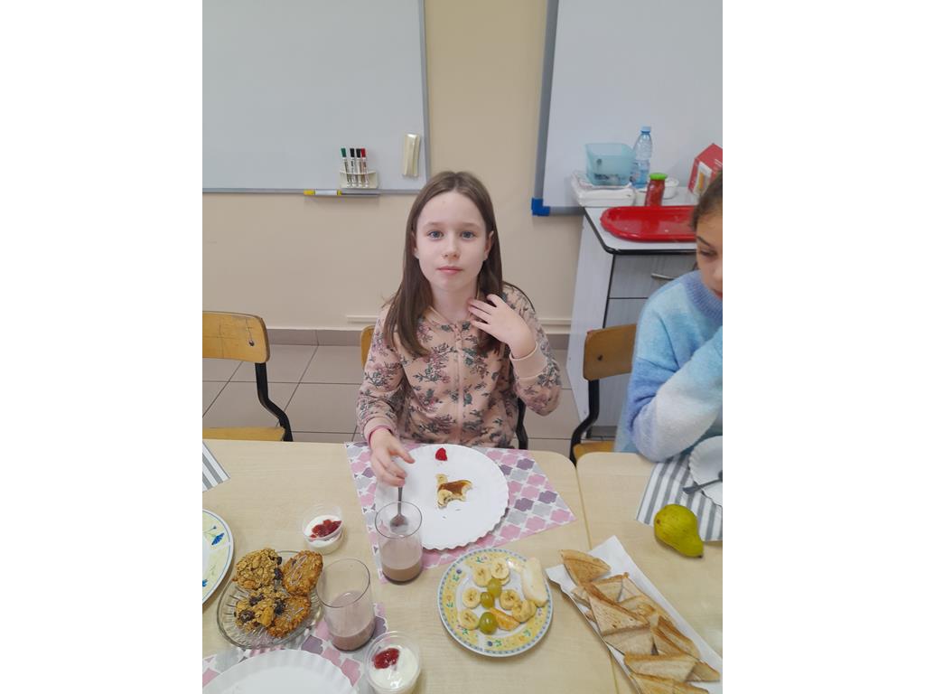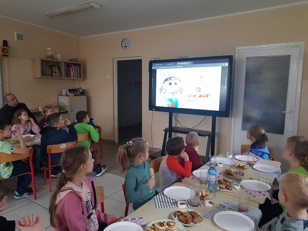 Przed śniadaniem Bożena Koniecka przedstawiła zasady zdrowego odżywiania w oparciu o piramidę zdrowia. Podkreśliła, jak ważną rolę dla organizmu ma spożywanie pierwszego i drugiego posiłku oraz picie wody. Zbilansowane śniadanie powinno być urozmaicone i zawierać produkty z różnych grup piramidy żywieniowej, a więc produkty zbożowe, warzywa, owoce i przetwory mleczne. Uczniowie obejrzeli krótki film dydaktyczny pt. ,,Zuzia i piramida zdrowia”.