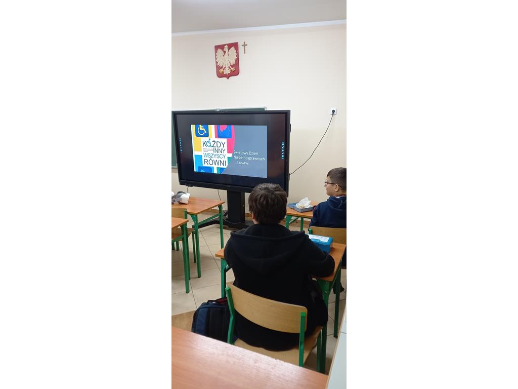 z Niepełnosprawnościami – święto ustanowione przez Zgromadzenie Ogólne ONZ w 1992 roku. Z tej okazji klasa VII uczestniczyła w lekcji zorganizowanej przez nauczyciela wspomagającego, na temat osób z niepełnosprawnościami. Głównym celem zajęć było zapoznanie uczniów z podstawowymi rodzajami niepełnosprawności, motywowanie uczniów do burzenia funkcjonujących