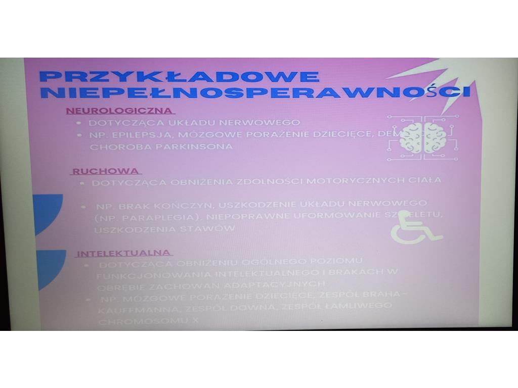 Na początku lekcji uczniowie wypisywali na jednej stronie kartki wszystko to w czym są dobrzy, a na drugiej stronie to z czym mają trudności, z czym nie radzą sobie. Uczniowie uświadomili sobie, że każdy ma jakieś trudności i ograniczenia tak jak osoby z niepełnosprawnością. Następnie podczas oglądania prezentacji zapoznali się z różnymi rodzajami niepełnosprawności.